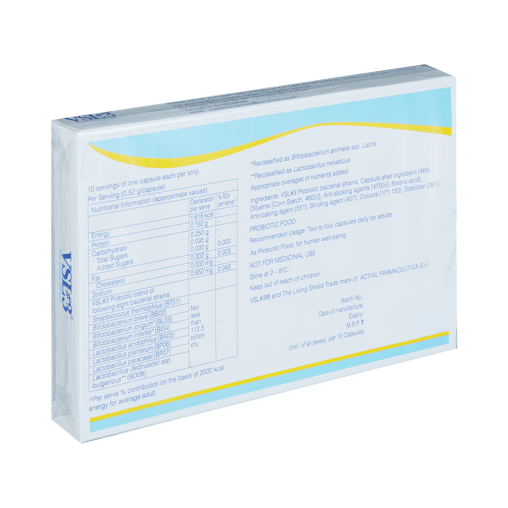 In Treatment of Irritable bowel syndromeIrritable bowel syndrome is a chronic (long-term) inflammatory disease of the large intestine (colon) that usually needs long term management. This can lead to bleeding, frequent diarrhea and abdominal pain. VSL 3 Capsule can relieve these symptoms effectively. Continue taking VSL 3 Capsule for as long as the doctor may advise you to. You need to take this medicine regularly to get the most out of it and you should drink plenty of fluids while taking it to make sure you stay hydrated.In Treatment of Ulcerative colitisUlcerative colitis is a disease of the large intestine (colon) and rectum in which the lining of the bowel becomes red and swollen. This can lead to bleeding, frequent diarrhea and abdominal pain. VSL 3 Capsule contains beneficial bacteria that protect the inner layers of your stomach and intestines. It relieves these symptoms and also helps you to stay well by preventing them from coming back. You need to take this medicine regularly to get the most out of it and you should drink plenty of fluids while taking it to make sure you stay hydrated.show moreshow less