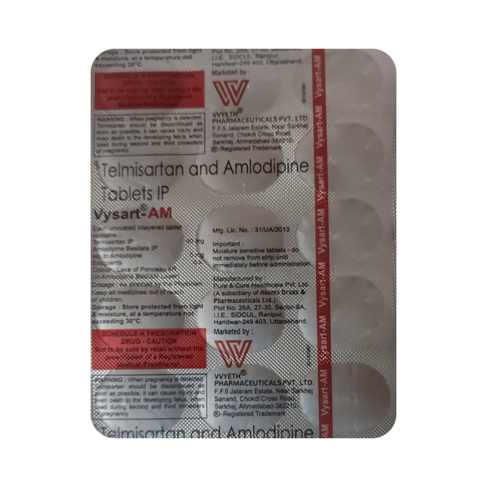 Vysart-AM Tablet is a combination of two medicines: Telmisartan and Amlodipine. Telmisartan is an angiotensin receptor blocker (ARB) and Amlodipine is a calcium channel blocker (CCB). They work by relaxing the blood vessels and making the heart more efficient at pumping blood throughout the body. Together, they lower blood pressure effectively