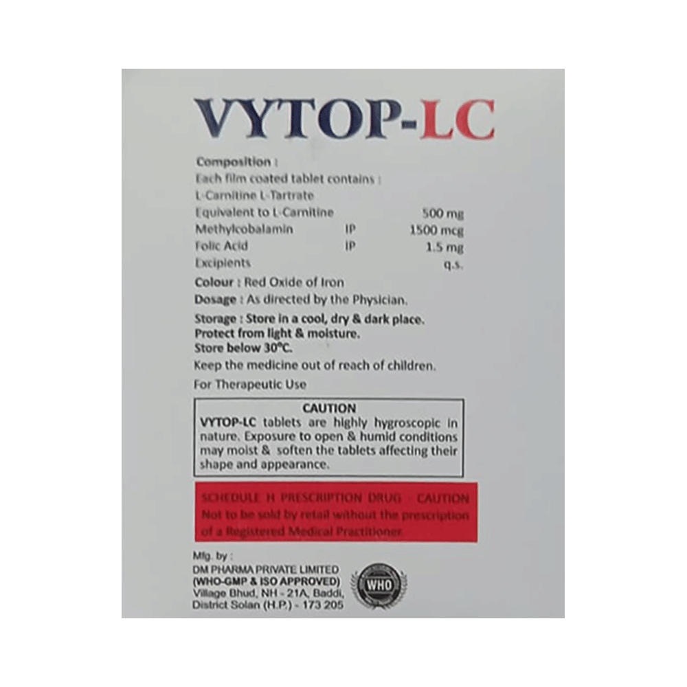 Vytop-LC Tablet is a combination of vitamin B9, B12, L-carnitine L-tartrate. Folic acid is essential for production of red blood cells. It prevents and treats folate deficiency and anemia. When taken by pregnant women, Folic acid prevents miscarriage, preterm labor, and neural tube defects in infants. Levo-carnitine L-tartrate helps turn the fats present in ingested food into energy. It decreases insulin resistance and oxidative stress and improves immune function. Methylcobalamin corrects vitamin B12 deficiency thereby helping in treating certain anemias and nerve problems.