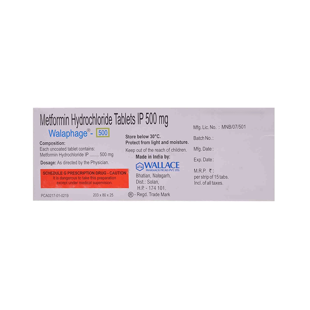 Walaphage 500 Tablet is a medicine used to treat type 2 diabetes mellitus. It helps control blood sugar levels and thus prevents serious complications of diabetes. It is also used to treat a menstruation-related disorder known as polycystic ovary syndrome (PCOS) in women. Walaphage 500 Tablet is best taken with food to avoid nausea and abdominal pain. You should take it regularly, at the same time each day, to get the most benefit. You should not stop taking this medicine unless your doctor recommends it. Your lifestyle plays a big part in controlling diabetes. Therefore, it is important to stay on the diet and exercise program recommended by your doctor while taking this medicine.The most common side effects of this medicine include diarrhea, nausea, vomiting, abdominal discomfort, headache, and loss of appetite. Some people may develop hypoglycemia (low blood sugar level) when this medicine is taken along with other antidiabetic medicines or alcohol or upon skipping a meal. Monitor your blood sugar levels regularly while taking it.Before taking this medicine, inform your doctor if you have any kidney, liver, or heart problems. Pregnant or breastfeeding women should also consult their doctor before taking it. Your doctor will check your kidney function before starting treatment with it. Avoid excessive alcohol intake while taking it, as this may increase the risk of developing some side effects.