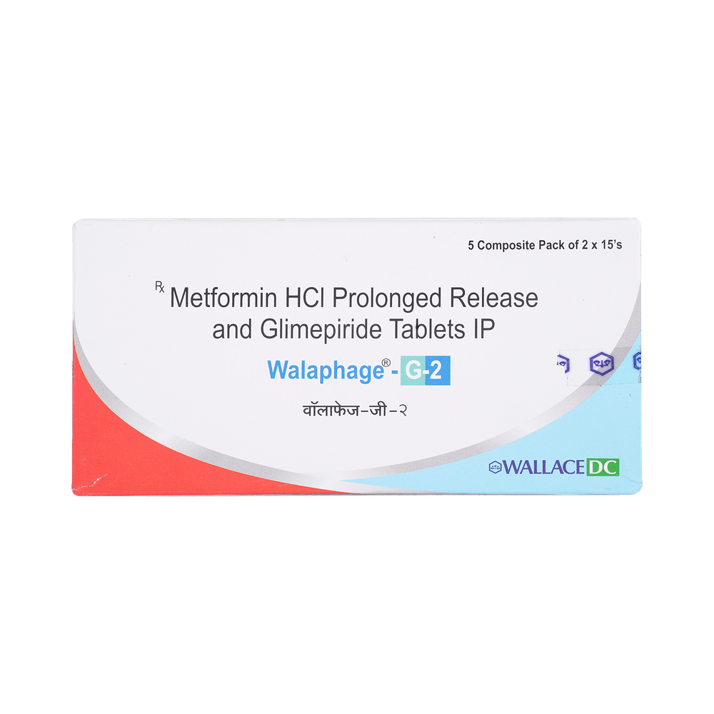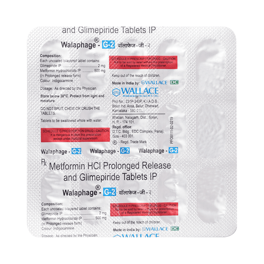 Walaphage G 2 Tablet PR is a combination of two antidiabetic medicines: Glimepiride and Metformin. Glimepiride is a sulfonylurea that works by increasing the amount of insulin released by the pancreas to lower the blood glucose. Metformin is a biguanide that works by lowering glucose production in the liver, delaying glucose absorption from the intestines, and increasing the body's sensitivity to insulin.