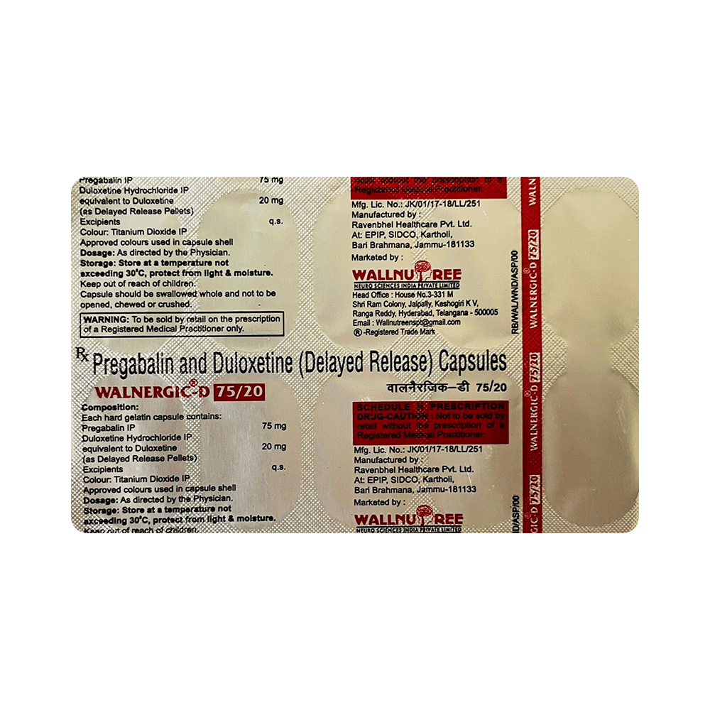 Walnergic-D 75/20 Capsule DR is a combination of two medicines: pregabalin and duloxetine. Pregabalin decreases neurotransmitter release, while duloxetine boosts serotonin and norepinephrine levels to modulate pain perception, working together to relieve nerve pain.