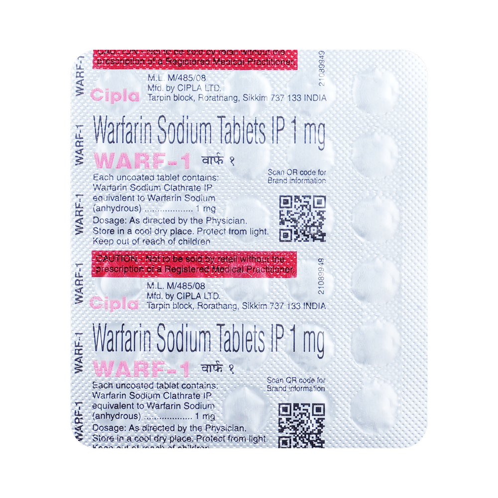 Warf 1 Tablet is an oral anticoagulant that helps prevent the formation of harmful blood clots in the legs, lungs, brain, and heart. It is used for deep vein thrombosis, pulmonary embolism, and stroke prevention. Warf 1 Tablet should be taken as advised by the doctor. You may take it with or without food, but it is better to take it at a fixed time. This medicine should not be stopped abruptly without consulting the doctor. You should take this medicine regularly to get the most benefit, even if you feel fine.Common side effects of Warf 1 Tablet include fatal and nonfatal hemorrhage from any tissue or organ. Use of this medicine may increase your risk of bleeding. Let your doctor know immediately if you see a pinpoint rash or blood in your vomit, urine, or stool. In rare cases, Warf 1 Tablet may also cause skin necrosis (death of skin cells) or purple toe syndrome, which should be reported to your doctor right away.If you are going under any surgery or dental treatment, then you may need to stop this medicine for some time, but only after consulting with your doctor. Before taking it, you must inform the doctor if you are suffering from any kidney or liver disease. Also, let your doctor know if you are pregnant or breastfeeding and about all the other medications that you are taking regularly. Patients with kidney problems should regularly monitor their INR (International Normalized Ratio) levels to ensure safe and effective use of Warf 1 Tablet. Consult your doctor for proper guidance.