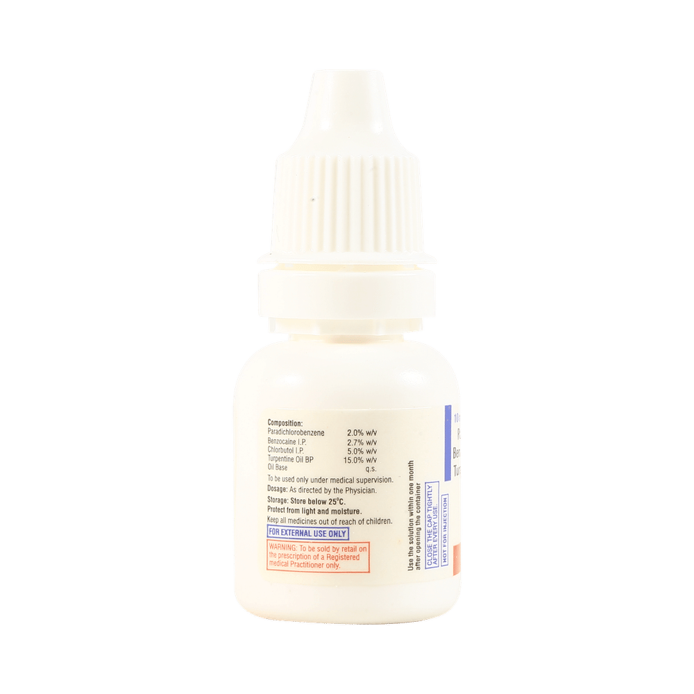 Salt Composition: Benzocaine (2.7% w/v) + Chlorbutol (5% w/v) + Paradichlorobenzene (2% w/v) + Turpentine Oil (15% w/v)