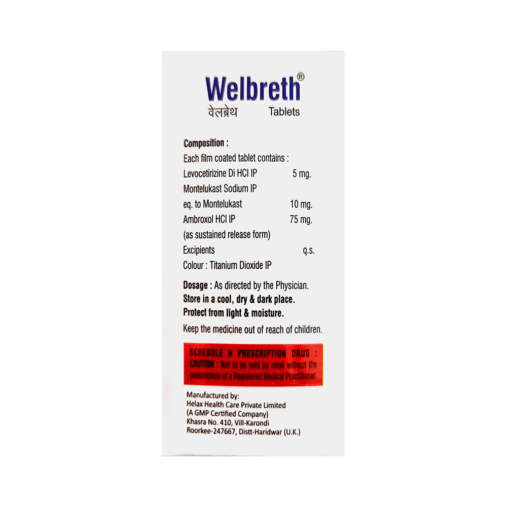 Welbreth Tablet SR is a combination of three medicines: Ambroxol, Levocetirizine and Montelukast. Ambroxol is a mucolytic which thins and loosens mucus (phlegm), making it easier to cough out. Levocetirizine is an antiallergic which relieves allergy symptoms like runny nose, watery eyes and sneezing. Montelukast is a leukotriene antagonist. It works by blocking the action of leukotriene, a chemical messenger. This reduces inflammation in the airways and nose and improves your symptoms.