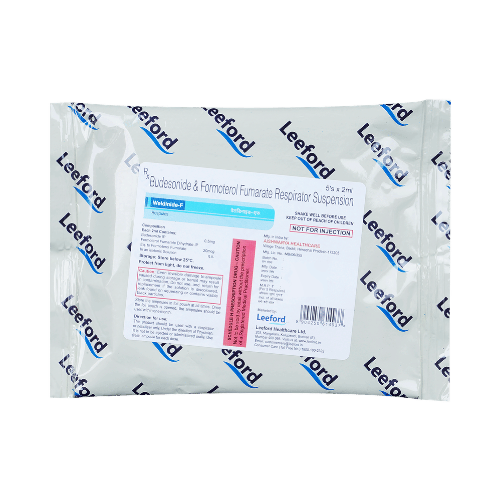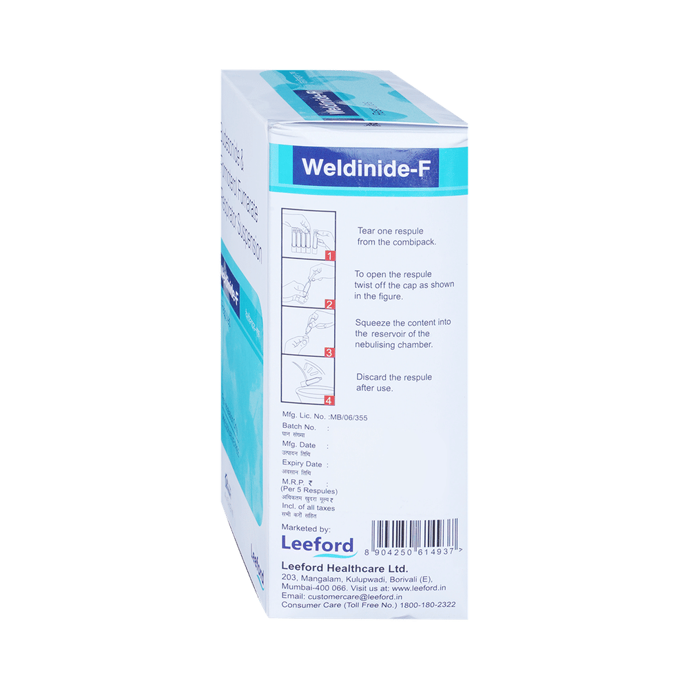 WELDinide F Respules (2ml Each) is a combination of two medicines in one inhaler. It relieves the long-term symptoms of asthma and COPD, making breathing easier. It works by inhibiting the release of certain chemical messengers that cause inflammation (swelling) and relaxes the muscles in the airways. Your doctor will tell you how often you need to use your inhaler. The effect of this medicine may be noticeable after a few days but will only reach its maximum after a few weeks. This medicine must be used regularly to be effective, so go on taking it even if you don't have any symptoms. That means it’s doing its job. If you stop taking it your symptoms may get worse. This medicine should not be used to relieve sudden shortness of breath. If sudden shortness of breath occurs, use your rescue inhaler. To get the benefit from this medicine you need to make sure you get your inhaler technique right, otherwise, it does not work as well.The most common side effects include headache, nausea, vomiting, stomach discomfort, and respiratory tract infection. If you get there, don’t stop taking it but do talk to your doctor. You can prevent some of these symptoms by rinsing your mouth and throat with water or brushing your teeth after using your inhaler. There are other, rarer side effects which can be serious. Talk to your doctor if you're worried about them.Before taking it, you should tell your doctor if you have any kidney or liver diseases so that your doctor can prescribe a suitable dose for you. You should also tell your doctor if you are pregnant, planning pregnancy or breastfeeding.
