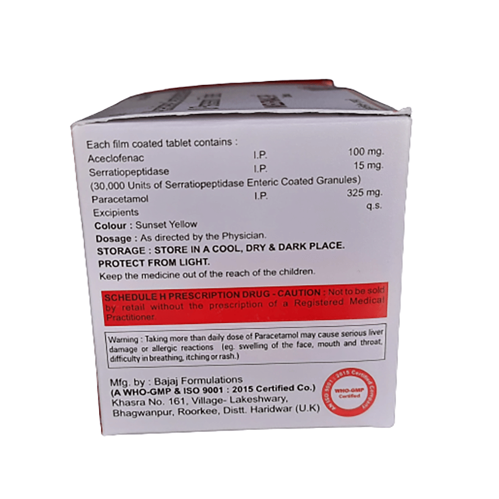 Salt Composition: Aceclofenac (100mg) + Paracetamol (325mg) + Serratiopeptidase (15mg)