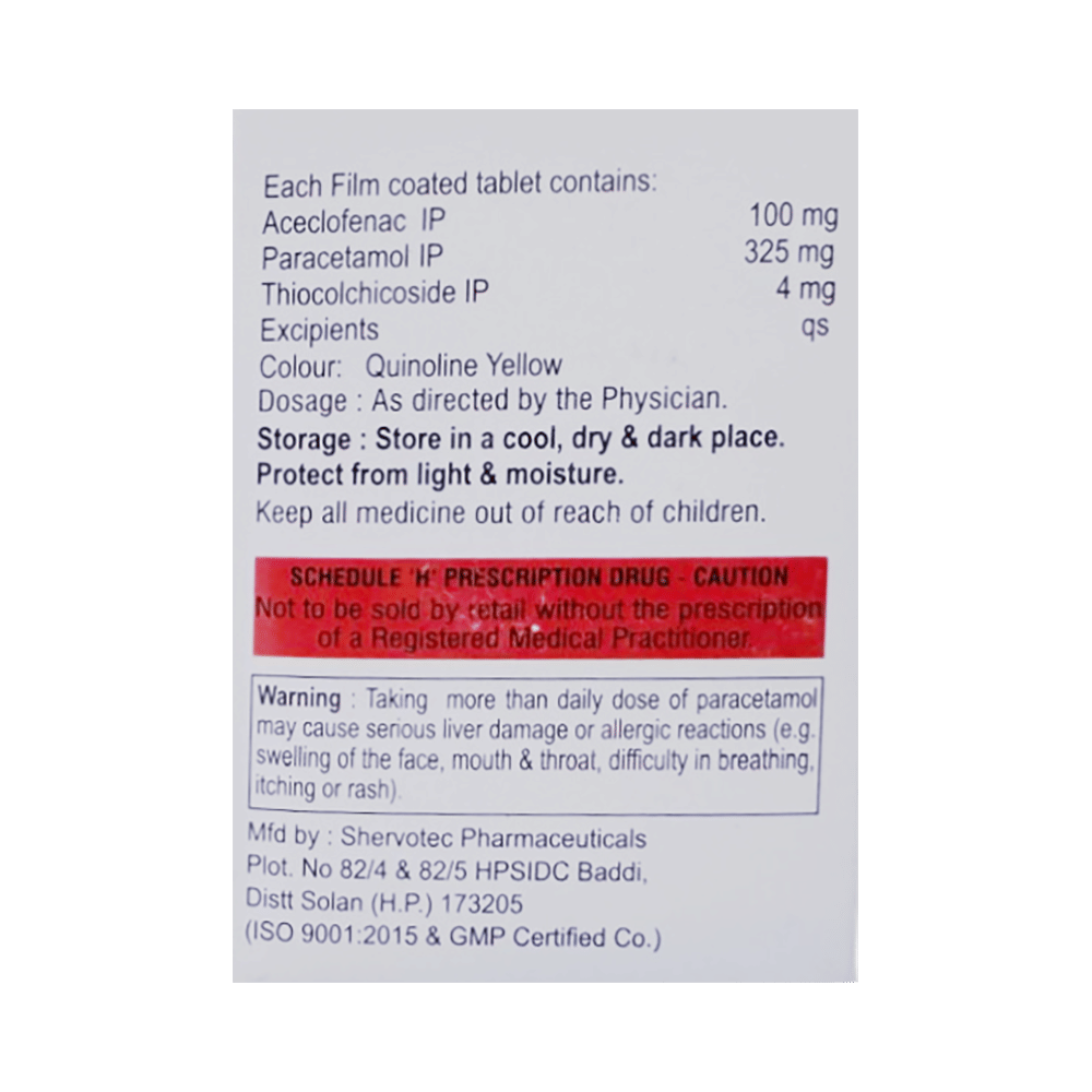 Salt Composition: Thiocolchicoside (4mg) + Aceclofenac (100mg) + Paracetamol (325mg)