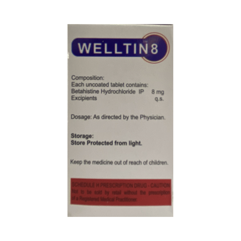 Welltin 8 Tablet is used to prevent and treat a disorder of the inner ear known as Ménière’s disease. The symptoms include dizziness (vertigo), ringing in the ears (tinnitus), and loss of hearing, probably caused by fluid in the ear. This medicine helps relieve the symptoms by reducing the amount of fluid. Welltin 8 Tablet should be swallowed whole with water and taken at the same time(s) each day to get the most benefit. Your doctor will decide what is the correct dose to relieve your symptoms and how often you need to take it. You may need to take this medicine for several months and you should take it for as long as prescribed by your doctor, even if you start feeling better. The most common side effects include headache, feeling sick, and indigestion (dyspepsia). You may also get stomach pain and bloating. Taking the medicine with food can help reduce stomach problems.  Before taking this medicine, you should talk to your doctor if you have a stomach ulcer, asthma, or high or low blood pressure. You must also tell him/her what other medicines you are taking, to make sure you are safe. Also speak to your doctor if you are pregnant, trying to become pregnant, or breastfeeding.