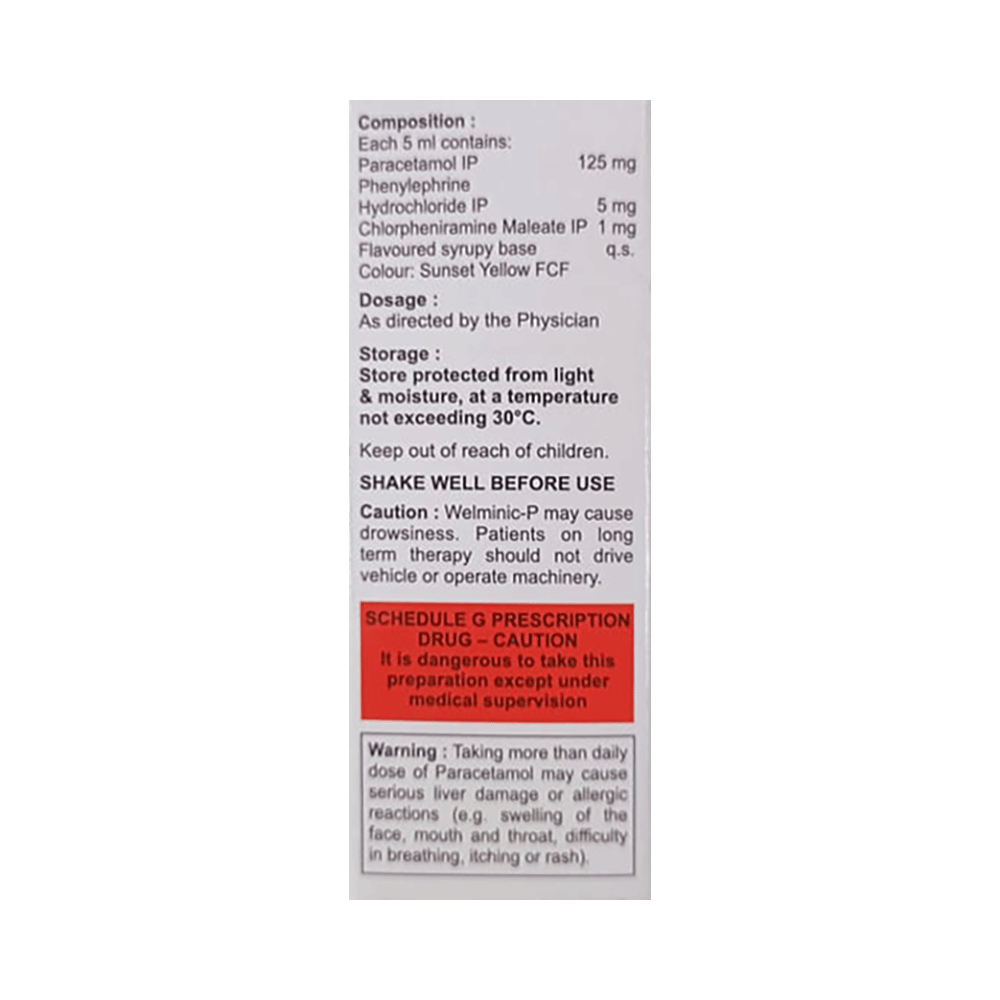Welminic-P 125mg Gluten Free Syrup is a medicine used in the treatment of common cold symptoms. It provides relief from symptoms such as headache, sore throat, runny nose, muscular pain, and fever. Welminic-P 125mg Gluten Free Syrup can be taken with or without food. The dose and duration will depend on the severity of your condition. You should keep taking the medicine even if you feel better until the doctor says it is alright to stop using it.Using this medicine may cause a few common side effects such as nausea, vomiting, sleepiness, dizziness, and headache. If any of these side effects do not resolve with time or get worse, you should let your doctor know. Your doctor may be able to suggest ways of preventing or reducing the side effects. In general, you should try to use the smallest amount necessary to control your symptoms.Before using the medicine, you should tell your doctor if you have any other medical conditions or disorders. To make sure it is safe, you should let your doctor know all the other medicines you are taking. Also, tell your doctor if you have any problems with the liver or kidneys. Avoid consumption of alcohol while on treatment with this medicine as it may increase the chance of some side effects. Pregnant and breastfeeding women should consult their doctors first before using the medicine.