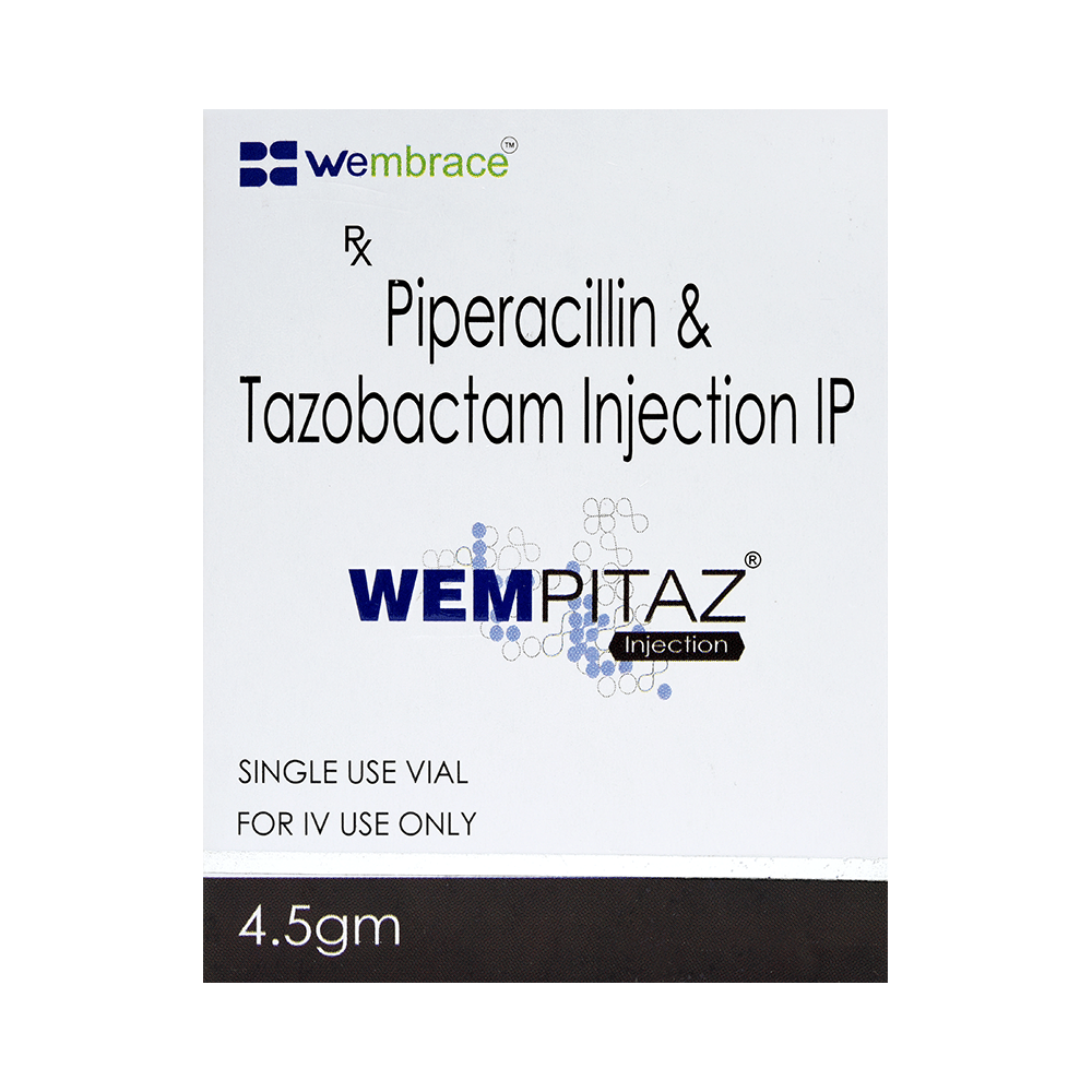 Wempitaz Injection is a combination of two antibiotics. It is used to treat various types of bacterial infections. It fights against the infection by killing the microorganisms. Wempitaz Injection is generally administered by a healthcare professional and should not be self-administered. Depending on the severity of your underlying illness, your doctor will decide the precise dose and schedule as per which this injection is to be given. It is strictly advised to be used as per the doctor’s prescription.Some of the common side effects of this medicine include nausea, vomiting, diarrhea, and rash. Additionally, you may notice some injection site reactions like pain, swelling, or redness. You should consult your doctor if these side effects do not get better with time and persist for a longer duration.Before using the medicine, you should tell your doctor if you are allergic to any antibiotics or have any kidney or liver problems. Your doctor may change the dose or prescribe a different medicine. This medicine is generally considered safe to use during pregnancy and breastfeeding if used under a doctor’s supervision.