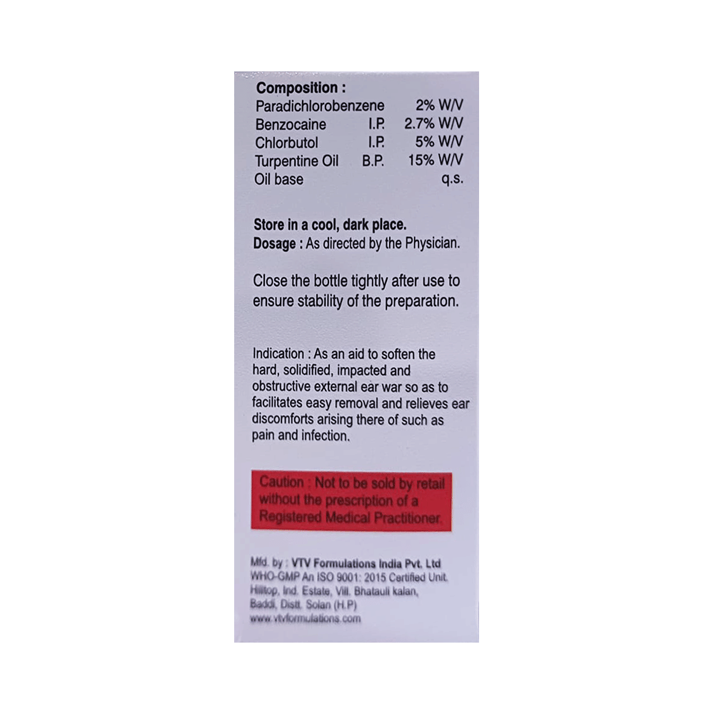 Salt Composition: Benzocaine (2.7% w/v) + Chlorbutol (5% w/v) + Paradichlorobenzene (2% w/v) + Turpentine Oil (15% w/v)