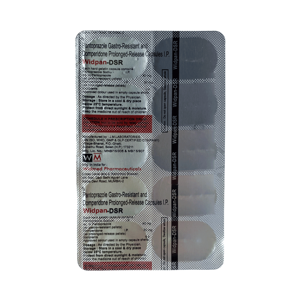 Widpan-DSR Capsule is a medicine that is used to treat conditions like acid reflux disease (GERD), erosive esophagitis, gastritis, gastric and duodenal ulcers, and indigestion with symptoms like heartburn, bloating, and regurgitation. It works by lowering acid production and helping the stomach empty faster. Take Widpan-DSR Capsule exactly as prescribed by your doctor, usually once daily before breakfast. Swallow it whole with water; do not crush or chew. To get the best results, maintain a healthy diet, avoid late-night meals, caffeine, spicy or oily foods, and stop smoking or alcohol use. Do not skip doses or stop early, even if you feel better, as that may lead to a return of the symptoms.The most common side effect of Widpan-DSR Capsule is dry mouth. It may also cause headache, dizziness, diarrhea, nausea, or mild stomach discomfort in some people. These are usually temporary. If you experience persistent vomiting, irregular heartbeat, rash, or severe diarrhea, contact your doctor immediately. Staying hydrated and taking the medicine before meals may help reduce stomach-related side effects.Inform your doctor about any liver, kidney, or heart problems before starting Widpan-DSR Capsule. Avoid taking it with other drugs that may affect heart rhythm or interact with domperidone or pantoprazole. Do not use it if you have a history of gastrointestinal bleeding or obstruction, or if you are allergic to any of the ingredients in the medicine. Pregnant or breastfeeding women should consult their doctor before use.