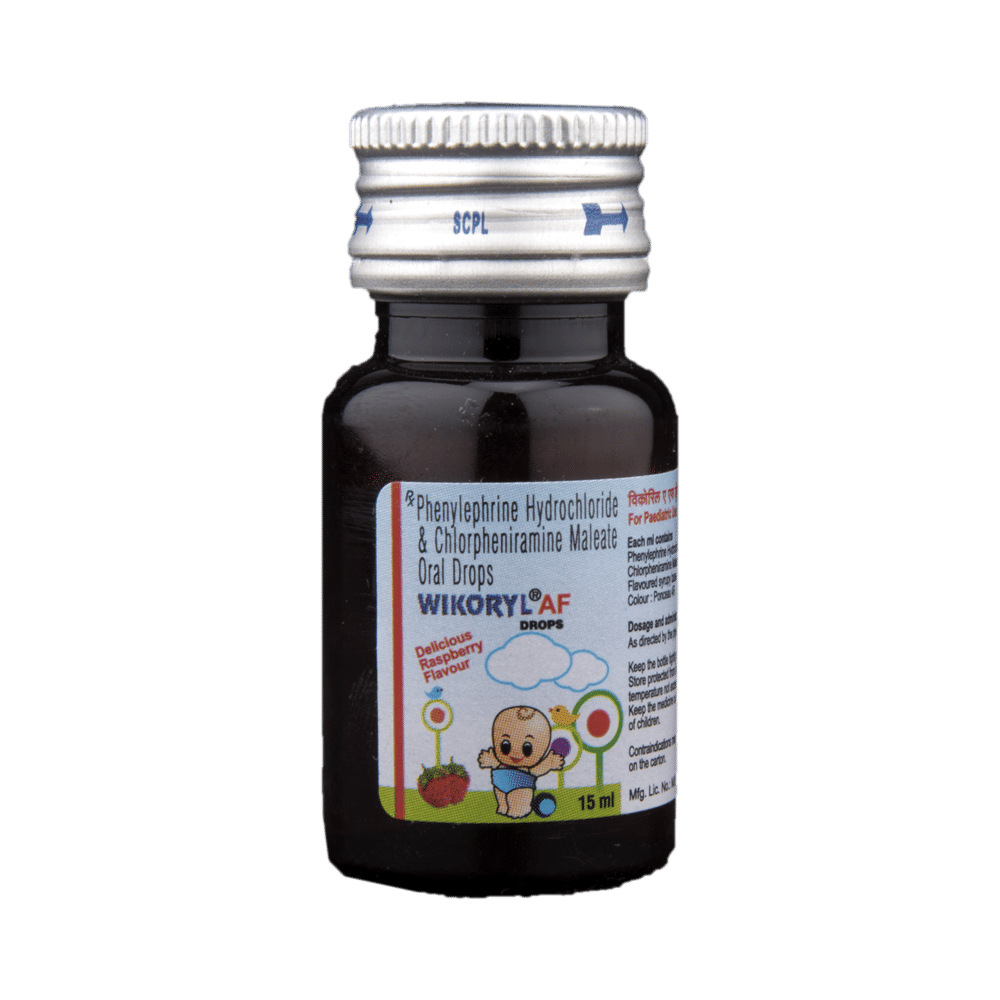 Wikoryl AF Drops is a combination medicine used for the symptomatic treatment of common cold in children. It helps relieve discomfort caused by a runny nose, blocked nose, and sneezing, allowing the child to breathe more easily and feel better. Wikoryl AF Drops may be given to your child with or without food. Always follow the exact dose and duration prescribed by the doctor. The dosage will depend on your child’s age, weight, and the severity of symptoms. Do not stop the medicine early, even if your child seems to be feeling better, unless advised by the doctor.Common side effects may include nausea, vomiting, or headache. These are usually mild and temporary. However, if you notice anything unusual or are concerned about how your child is responding to the medicine, consult your doctor promptly. This medicine may also cause drowsiness, so avoid engaging your child in activities that require alertness until you know how it affects them.Make sure your child stays well hydrated while taking Wikoryl AF Drops. Inform your doctor if your child has any history of liver or kidney problems, as the dose may need to be adjusted accordingly.Note: As per the Ministry of Health and Family Welfare, Wikoryl AF Drops should not be used in children below 4 years of age.