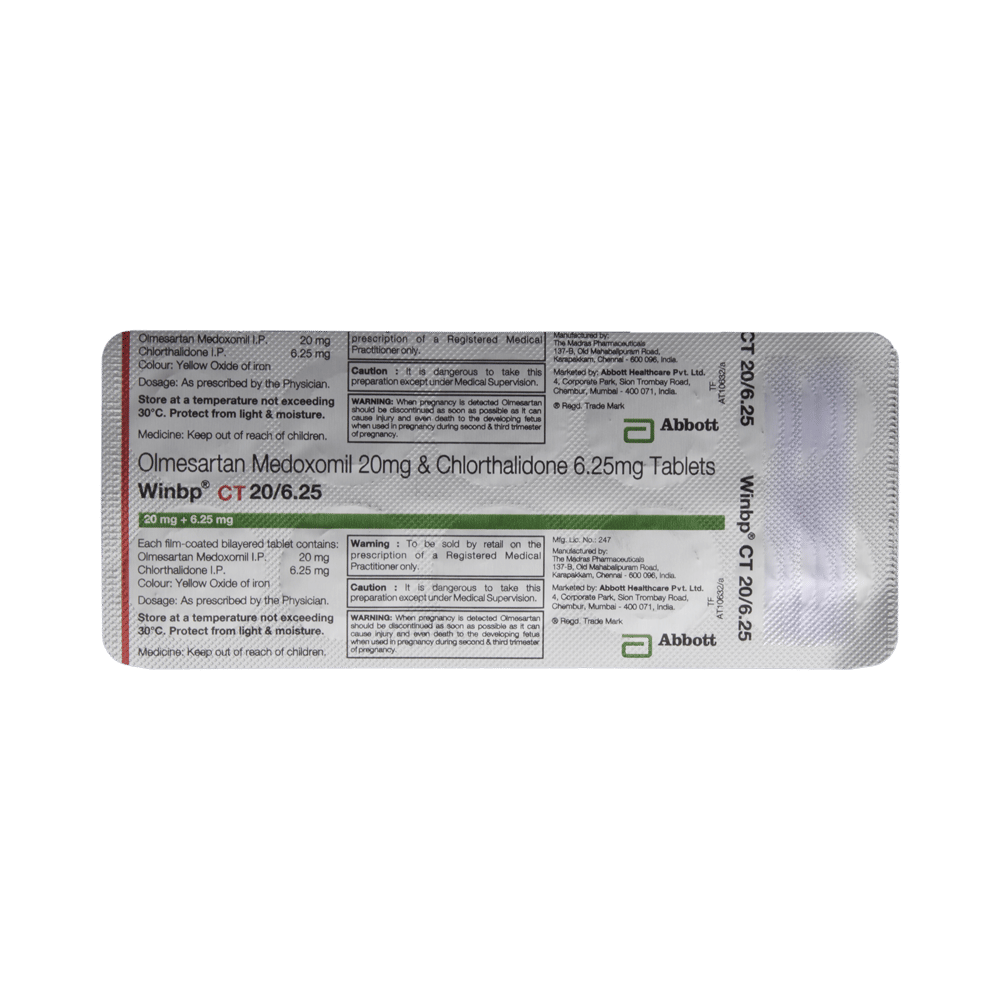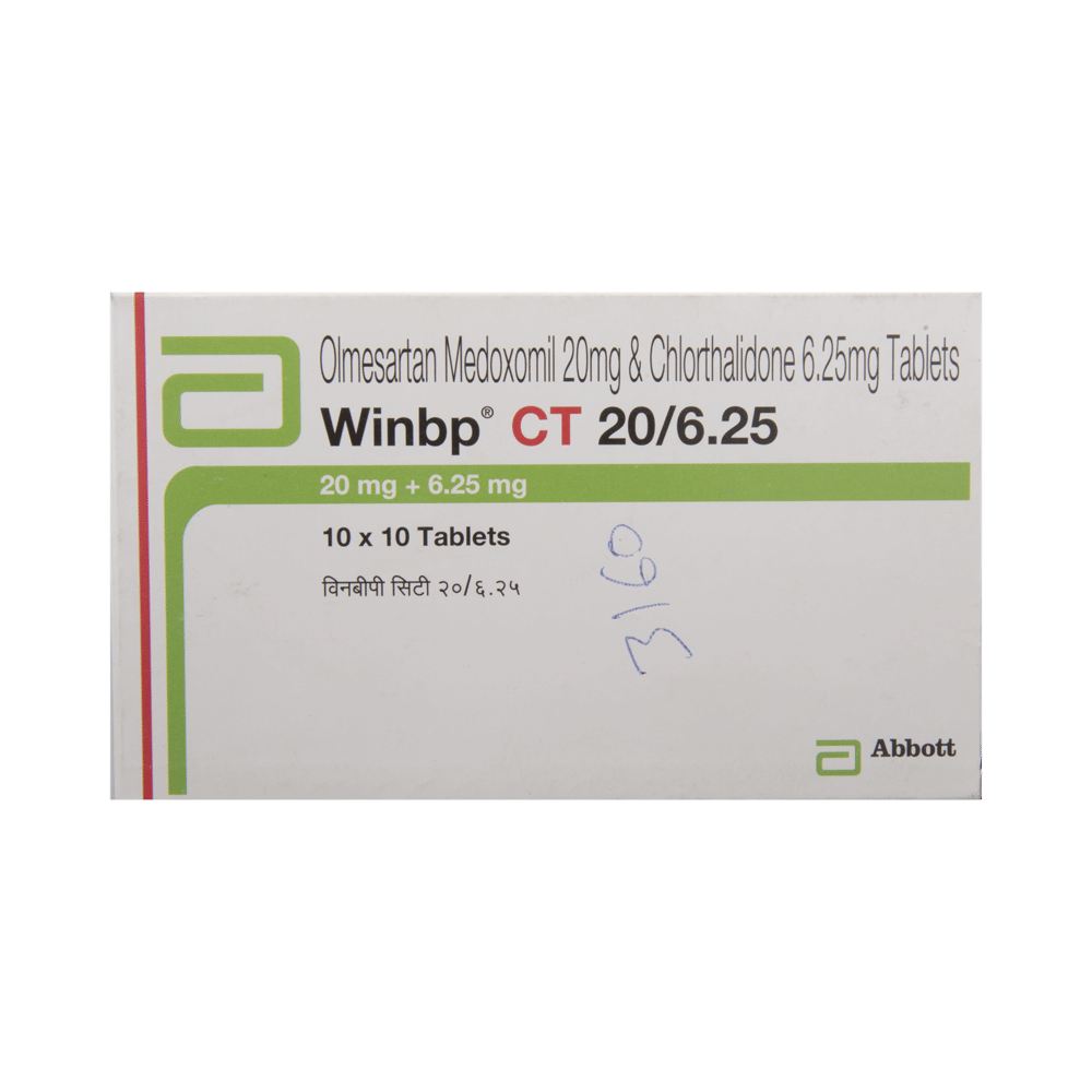 In Hypertension (high blood pressure)Winbp CT 20/6.25 Tablet is a combination of two medicines namely Olmesartan and chlorthalidone. It is generally used when one medicine alone is not controlling your blood pressure effectively. Olmesartan works by relaxing and widening your blood vessels so your blood can flow more easily. This will lower your blood pressure. Chlorthalidone is known as a diuretic (water pill) which increases urine output thereby lowering blood pressure. If your blood pressure is controlled you are less at risk of having a heart attack, stroke, or kidney problems. The medicine must be taken regularly as prescribed to be effective. You do not usually feel any direct benefit from taking this medicine, but it works in the long term to keep you well.