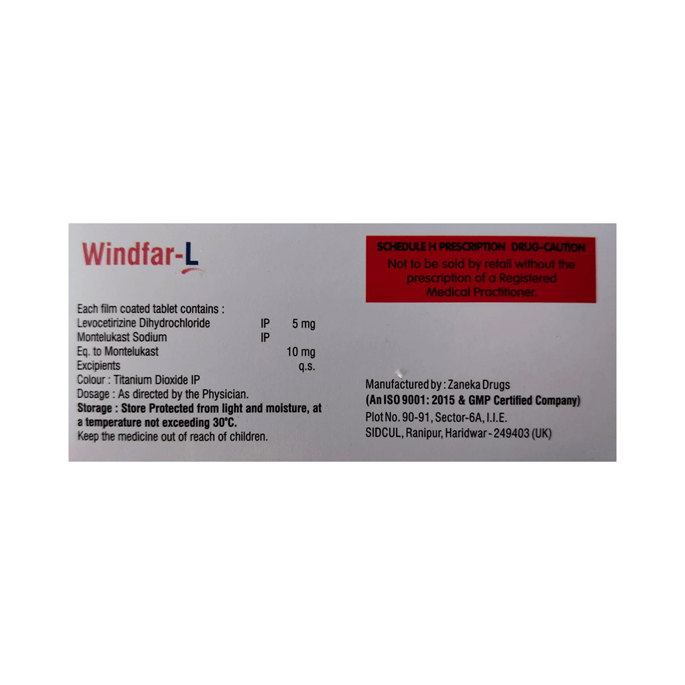 Windfar-L Tablet is a combination of two medicines: Levocetirizine and Montelukast, which relieves sneezing and runny nose due to allergies. Levocetirizine is an antiallergic which blocks a chemical messenger (histamine) responsible for runny nose, watery eyes and sneezing. Montelukast is a leukotriene antagonist. It works by blocking another chemical messenger (leukotriene). This reduces inflammation (swelling) in the airways and nose, and improves symptoms.