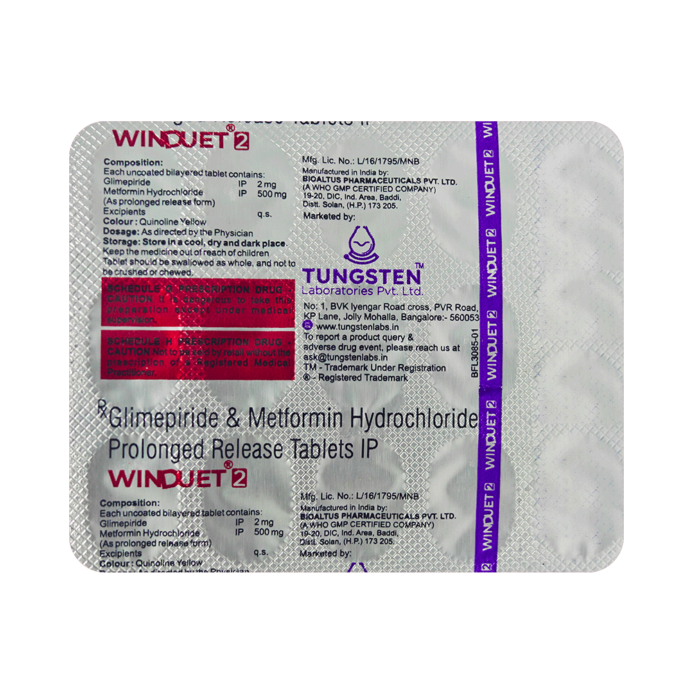 Winduet 2 Tablet PR is a combination of two antidiabetic medicines: Glimepiride and Metformin. Glimepiride is a sulfonylurea that works by increasing the amount of insulin released by the pancreas to lower the blood glucose. Metformin is a biguanide that works by lowering glucose production in the liver, delaying glucose absorption from the intestines, and increasing the body's sensitivity to insulin.