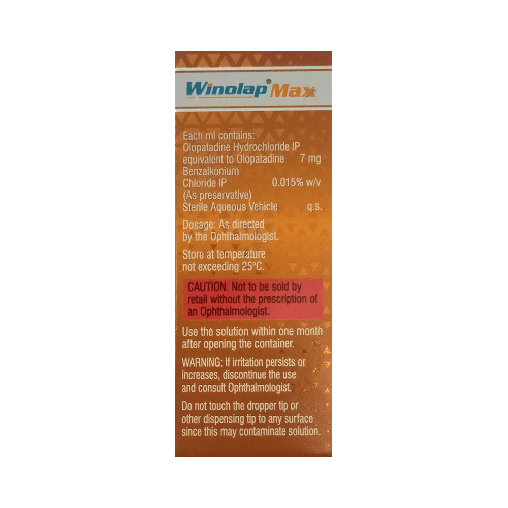 Winolap Max Eye Drop is a medicine used to treat allergic conjunctivitis, a condition that causes red, itchy, and watery eyes due to allergens. It works by blocking the effects of histamine and preventing the release of chemicals that cause allergic reactions, providing quick and lasting relief. Use Winolap Max Eye Drop exactly as prescribed by your doctor. Typically, it is applied 1-2 times a day, depending on your condition. Wash your hands before using the drops, tilt your head back, and apply one drop into the affected eye(s). Avoid touching the tip of the dropper to prevent contamination. For the best results, use it regularly and at the same time each day.Some common side effects of Winolap Max Eye Drop include eye pain, eye irritation, eye discomfort, weakness, and dry mouth. These side effects usually go away on their own after a few minutes. If side effects persist or worsen, or if you experience more severe reactions like swelling, severe itching, or rash, contact your doctor immediately. To prevent side effects, avoid using more drops than prescribed and follow the instructions carefully.While using Winolap Max Eye Drop, avoid driving or using machinery immediately after application if you experience blurred vision. If you wear contact lenses, remove them before applying the drops and wait at least 15 minutes before putting them back in. Do not use the drops if you are allergic to the medicine or any of its ingredients. Inform your doctor if you are pregnant, breastfeeding, or using any other medications to avoid potential interactions.