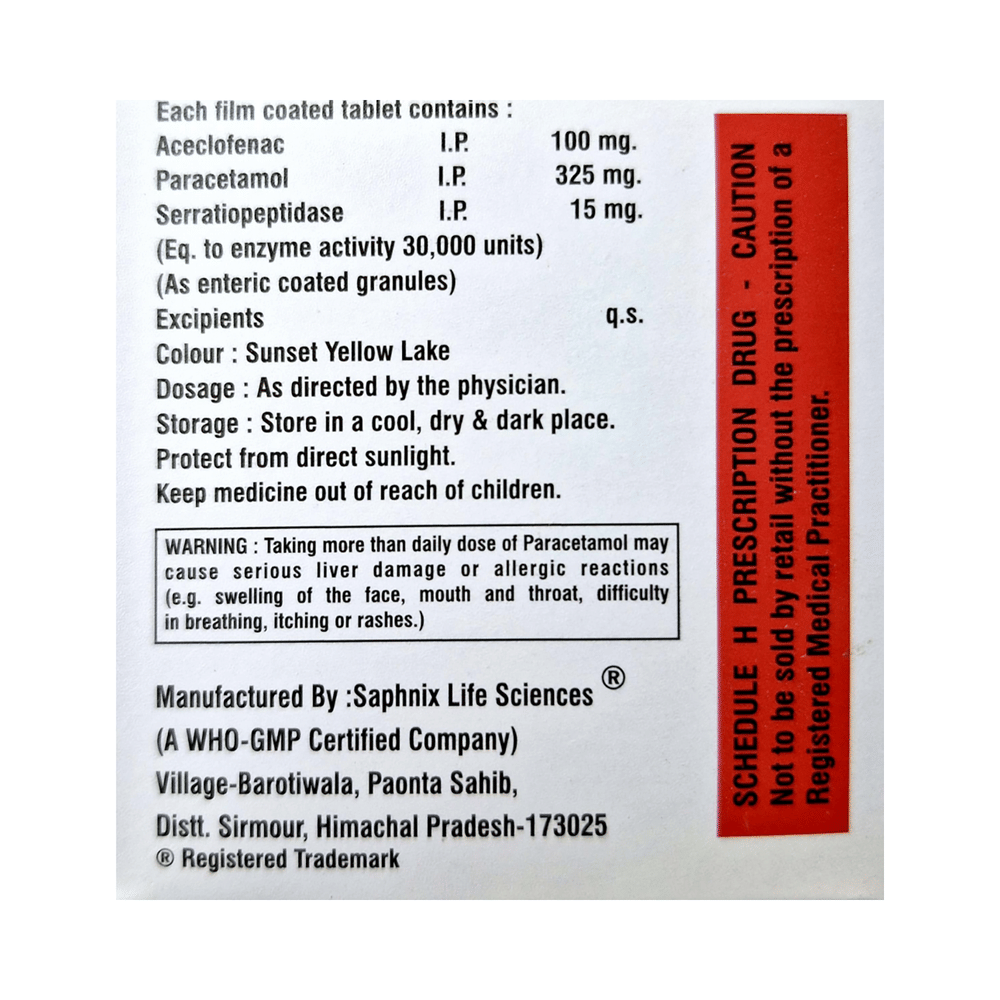 Salt Composition: Aceclofenac (100mg) + Paracetamol (325mg) + Serratiopeptidase (15mg)