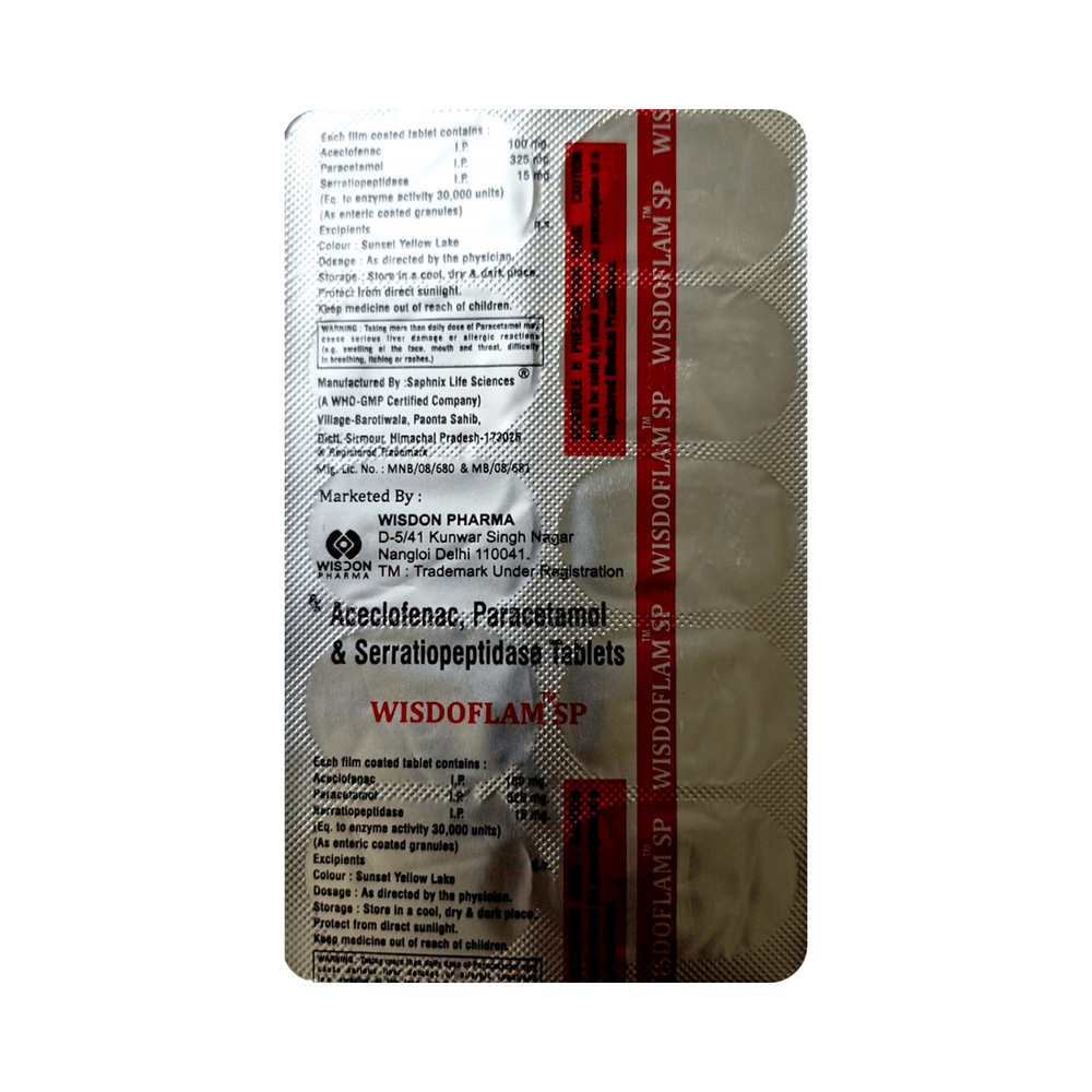 Wisdoflam SP Tablet is a combination of three medicines: Aceclofenac, Paracetamol and Serratiopeptidase. Aceclofenac is a non-steroidal anti-inflammatory drug (NSAID), and Paracetamol is an antipyretic (fever reducer). They work by blocking the release of certain chemical messengers in the brain that cause pain and fever. Serratiopeptidase is an enzyme which works by breaking down abnormal proteins at the site of inflammation and promotes healing.
