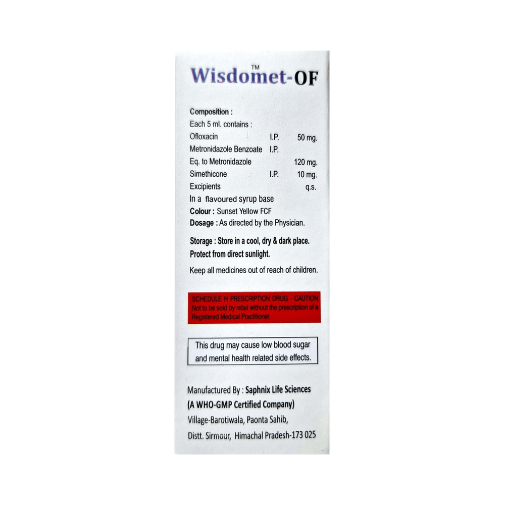 Wisdomet-OF Oral Suspension is given to children for the treatment of bacterial infections of the teeth, lungs, gastrointestinal tract, urinary tract, and genital tract. This medicine is also given as an empirical antibiotic for infected diarrhea mixed with blood and serious infections like peritonitis. Give Wisdomet-OF Oral Suspension to your child orally, preferably at a fixed time, either before or after meals. In case your child develops a stomach upset, prefer giving it with meals. Generally, this medicine is prescribed to be given two times a day, in the morning and evening. If your child vomits within 30 minutes of intake, repeat the same dose but do not double the dose if it is time for the next dose. Never change the dose, time, and way prescribed by the doctor since these depend upon the type and severity of the infection, your child’s age, and body weight.In some cases, this medicine may cause some minor and temporary side effects, including nausea, vomiting, weight loss, metallic taste, headache, loss of appetite, abdominal cramps, and mild skin rash. These side effects are temporary and recede when your child gets used to the medicine. In case the side effects persist or start bothering your child, consult your child’s doctor without any delay.Narrate your child’s complete medical history to your child’s doctor, including any previous episode of allergy, heart problem, liver impairment, and kidney malfunction. This information is critical for dose alterations and for planning your child’s overall treatment.