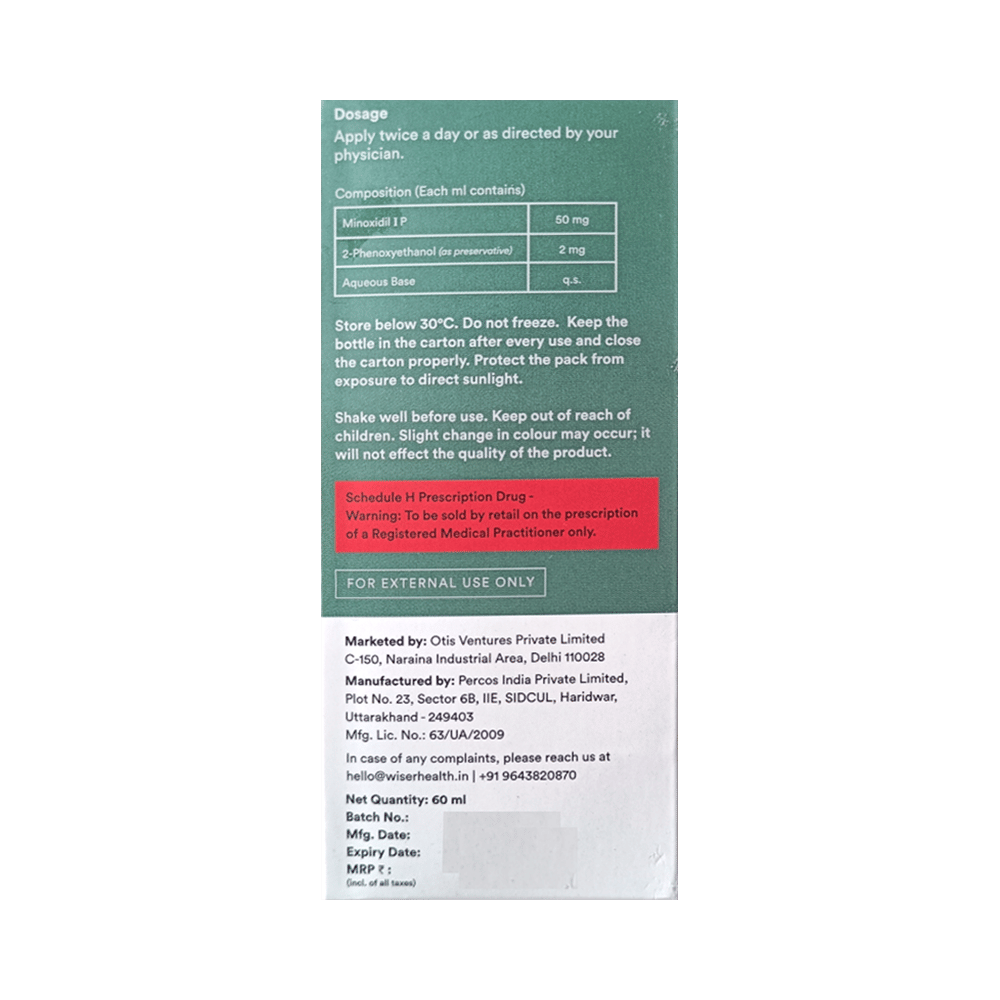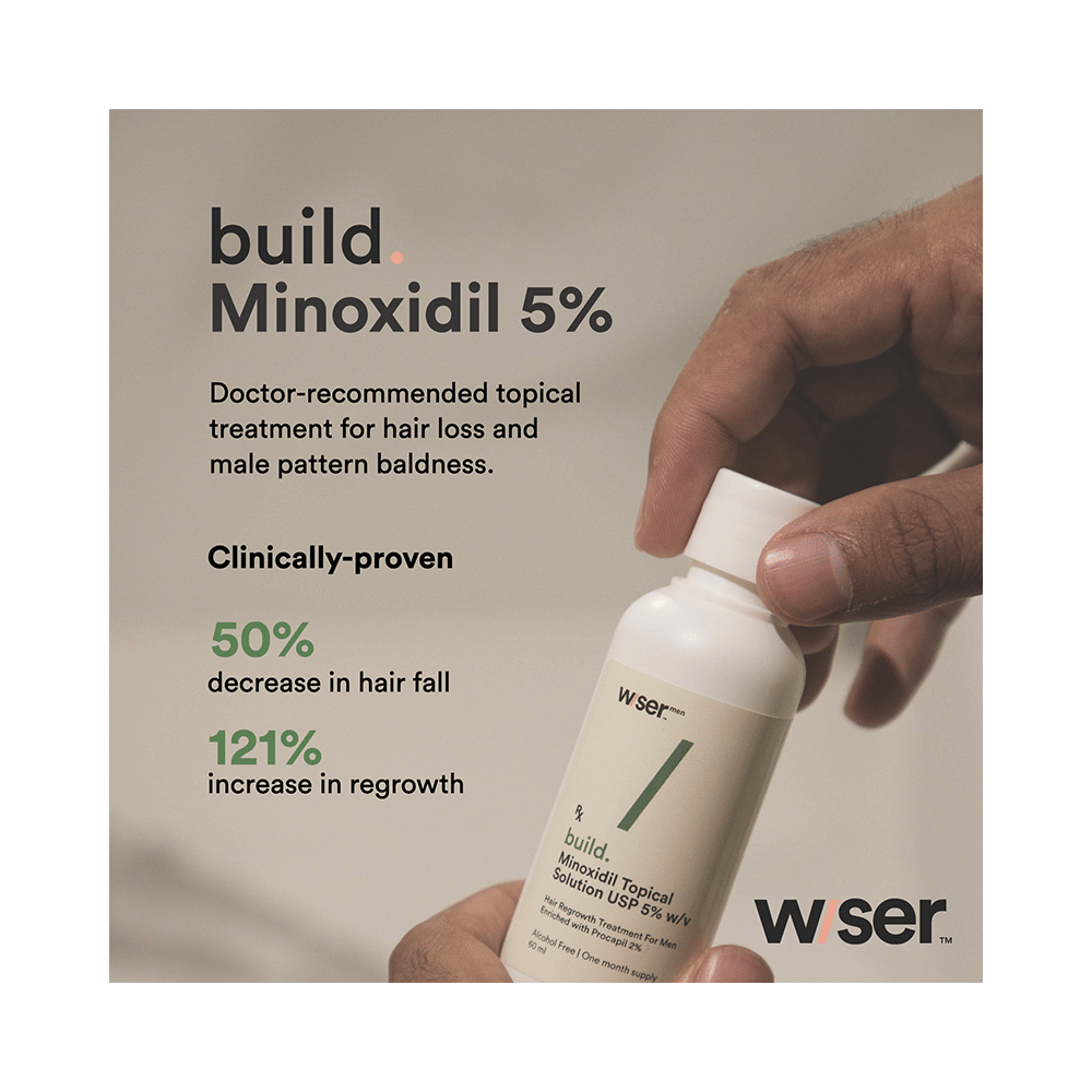 Wiser Men Build Minoxidil Topical Solution belongs to a class of drugs known as vasodilators. It is used to promote hair growth in men with male pattern baldness by improving blood flow to hair follicles, helping slow hair loss, and encouraging new hair growth when used regularly. Wiser Men Build Minoxidil Topical Solution should only be applied directly to the scalp area in the amount and in the way specified on the label or by your doctor. Clean and dry your scalp before using it. It may take approximately 2- 4 months to notice any hair growth. The first growth may be soft, colourless, and barely visible. Using more than recommended will not speed up hair growth and may increase the likelihood of side effects. This medication must be used continuously to maintain hair growth. Tell your doctor if your condition does not improve or worsen after using it for 4 to 6 months.The most common side effects of this medicine include itching, excessive hair growth, rash, and dermatitis. In case of accidental application in other areas, it may result in unwanted hair growth. Rinse thoroughly with plenty of water if you get it in your eyes, mouth, or broken skin. Talk to your doctor if you are bothered by the side effects or if they do not go away.People under 18 or over 65 should not usually use Wiser Men Build Minoxidil Topical Solution. It may also not be appropriate if your hair loss is due to medications (such as chemotherapy) or any nutritional deficiency. You should also not use this medicine if you have high blood pressure or use other creams or lotions to treat other scalp conditions. Talk to your doctor if you have heart disease or blood circulation problems.