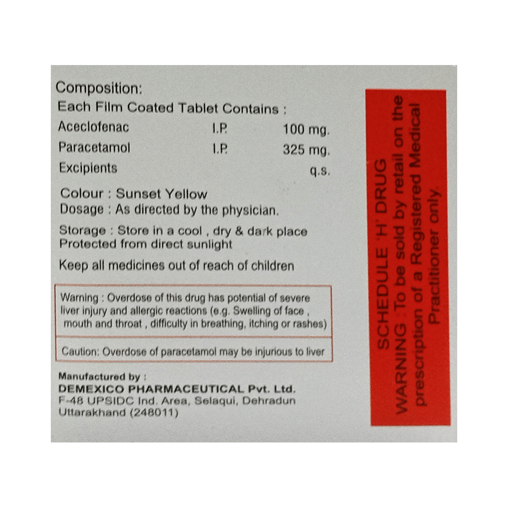 Salt Composition: Aceclofenac (100mg) + Paracetamol (325mg)
