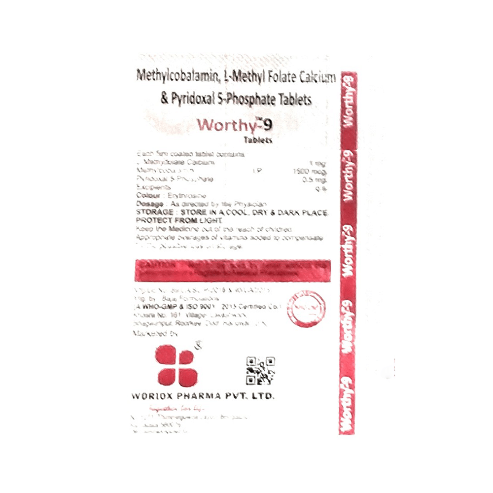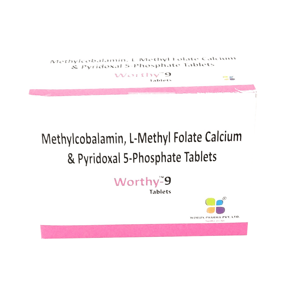 Worthy 9 Tablet is a combination of three nutritional supplements. L-Methyl Folate is a form of folate that replenishes the folic acid deficiency, this in turn helps in the formation of new red blood cells to treat or prevent anemia. Methylcobalamin and Pyridoxal-5-phosphate are vitamins. They restore any vitamin deficiencies in the body. This helps in maintaining proper hormonal balance in the body to ensure appropriate growth and functioning of the organs.