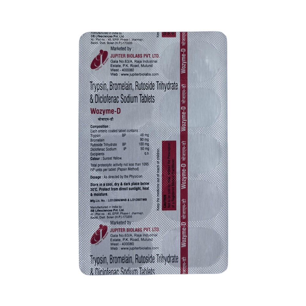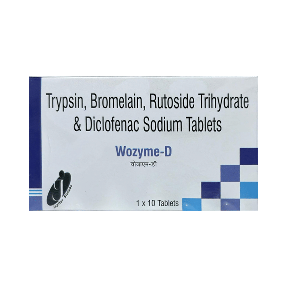 Wozyme D Tablet is a combination of four medicines: Trypsin, Bromelain, Rutoside and Diclofenac. Trypsin and Bromelain are enzymes. They increase blood supply and make the body produce substances that fight pain and swelling. Rutoside is an antioxidant which protects the body from damage by chemicals (free radicals) and further reduces swelling. Diclofenac is a non-steroidal antiinflammatory drug (NSAID) which works by blocking the release of certain chemical messengers (prostaglandins) in the brain that cause pain and inflammation (redness and swelling).