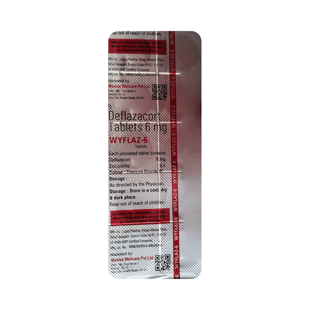Wyflaz 6 Tablet belongs to a group of medicines called steroids. It is used for the treatment of various diseases and conditions such as inflammatory conditions and autoimmune conditions. Wyflaz 6 Tablet works by inhibiting the release of substances that cause swelling or by changing how the immune system works. It can be taken on an empty stomach or after food. Taking the medicine regularly at the right times increases its effectiveness. It is important to keep taking the medicine regularly until your doctor tells you it is safe to stop.Use of this medicine may cause some common side effects such as increased appetite, weight gain, frequent urge to urinate, Cushing syndrome, cough, upper respiratory tract infection, abnormal hair growth, obesity, and nasopharyngitis. If any of these side effects bother you, let your doctor know.Wyflaz 6 Tablet can make it harder for you to fight off infections. Tell your doctor if you have any signs of infection such as a fever or sore throat. Before taking the medicine, you should let your doctor know of all the other medicines you are taking. Pregnant and breastfeeding women should consult their doctors before taking the medicine.