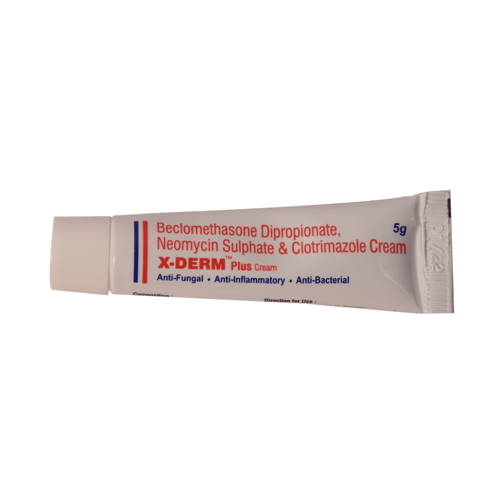 X Derm Plus Cream is a combination medicine that is used to treat various types of skin infections. It minimizes symptoms of inflammation such as redness, swelling, and itching. It also has antimicrobial action against infection-causing microorganisms. X Derm Plus Cream is only meant for external use and should be used as advised by your doctor. A thin layer of the medicine should be applied only to the affected areas of the skin with clean and dry hands. If it gets into your eyes, nose, mouth, or vagina rinse with water. It may take several days to weeks for your symptoms to improve, but you should keep using this medicine regularly. The course of the treatment should be completed to ensure better efficacy of the medicine. If your condition does not improve or gets worse, you should talk to your doctor.The most common side effect of this medicine includes itching, dryness, redness, and burning sensation at the application site. These are usually self-limiting. Serious side effects are rare. You must consult the doctor if you experience any allergic reaction (rashes, itching, swelling, shortness of breath, etc.).Before taking this medicine, it is important to tell your doctor if you are taking or have recently taken any other medicines for the same disease or other diseases. Pregnant and breastfeeding women should take this medicine with proper consultation and caution. If you are a known allergic to the medicine, you must refrain from using this medicine. You should consult the doctor about prescribing an alternative medicine for your condition.