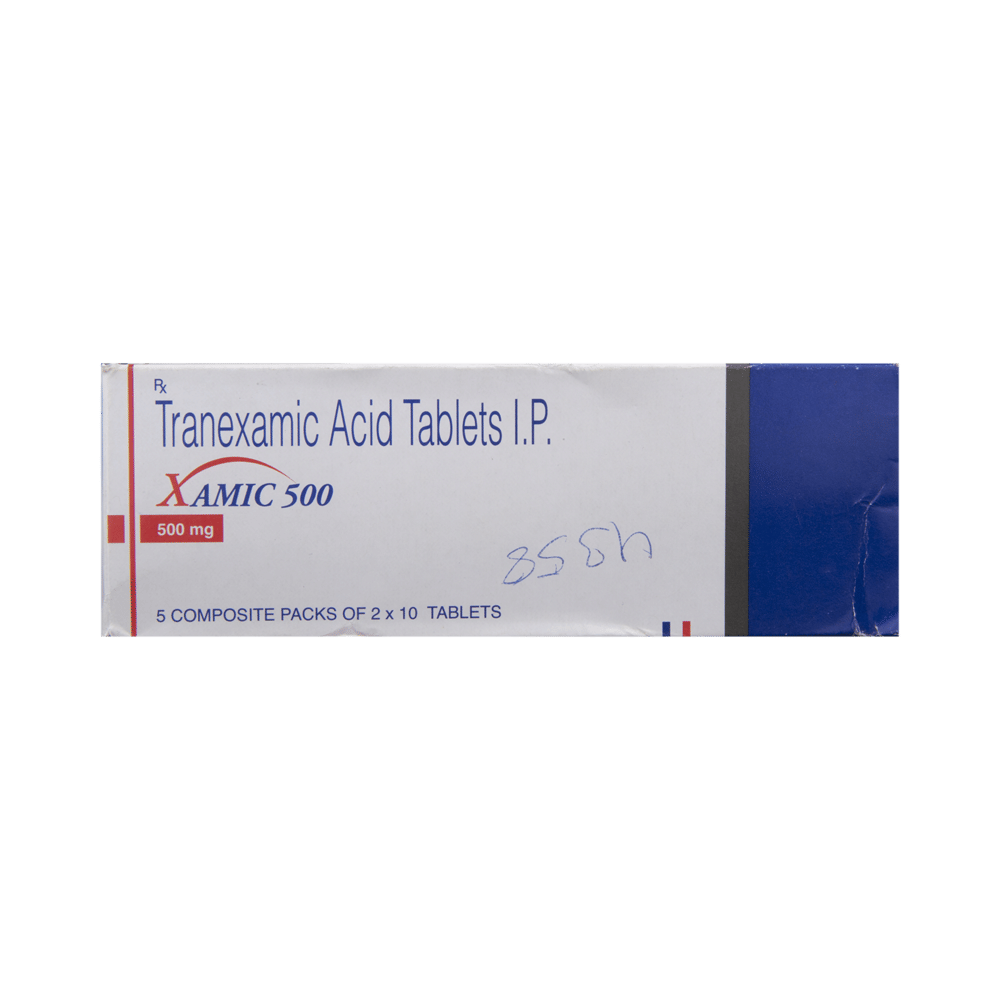 Xamic 500 Tablet is used to treat bleeding. It helps to prevent or reduce bleeding in conditions like tooth removal, heavy periods, dysfunctional uterine bleeding, nosebleed, and in any oral, prostate, or bladder surgery. Xamic 500 Tablet is an anti-fibrinolytic. It works by preventing the breakdown of clots which leads to the stoppage of bleeding. This medicine must be taken in the dose and duration as advised by the doctor. You should not take it if you have any known allergy to this medicine.The most common side effects include tiredness and pain in muscle, bone, or joint. Inform your doctor if you have undergone any cardiac surgery or you are suffering from any kidney disease.This medicine is safe to use in pregnant or breastfeeding mothers. It is also safe to use in patients suffering from liver diseases. It is advised not to consume alcohol after taking this medicine as there can be excessive drowsiness.