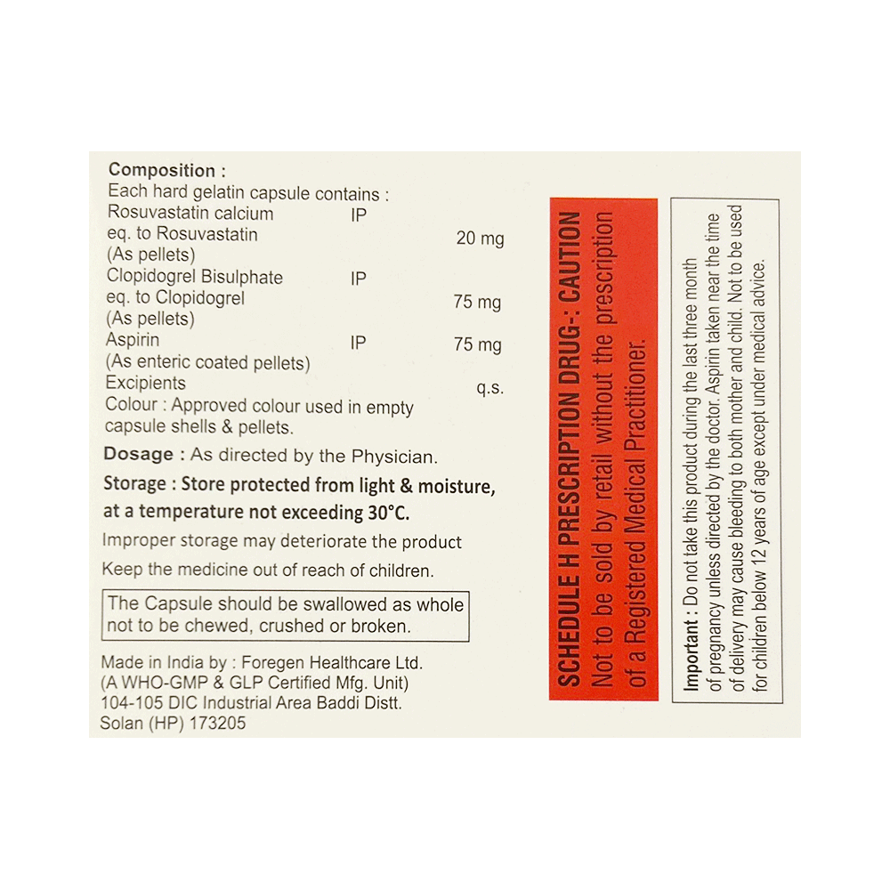Salt Composition: Aspirin (75mg) + Rosuvastatin (20mg) + Clopidogrel (75mg)