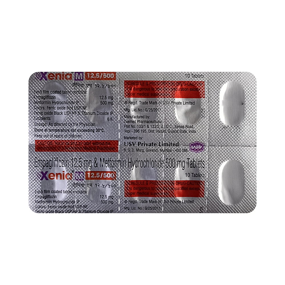 Xenia M 12.5/500 Tablet is a combination of two antidiabetic medicines: Empagliflozin and Metformin. Empagliflozin works by removing excess glucose from your body through urine. Metformin works by lowering glucose production in the liver, delaying glucose absorption from intestines and increasing the body's sensitivity to insulin. Together, they lower blood glucose more effectively.