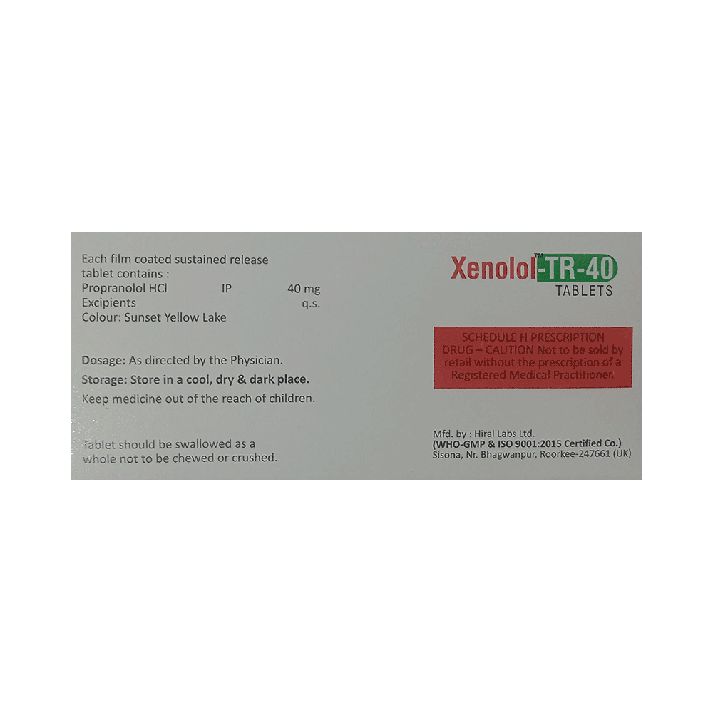 Take this medicine in the dose and duration as advised by your doctor. Swallow it as a whole. Do not chew, crush or break it. Xenolol-TR 40 Tablet may be taken with or without food, but it is better to take it at a fixed time.Avoid Xenolol-TR 40 Tablet with high-fat meals such as olive oil, nuts & seeds (Brazil nuts), dark chocolate, butter and meat.