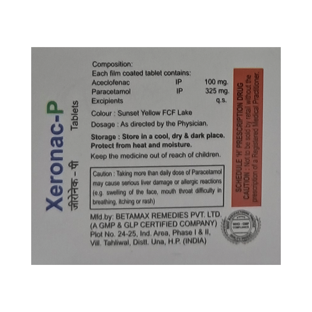 Xeronac-P Tablet is a combination of two medicines: Aceclofenac and Paracetamol. These medicines work by blocking the action of chemical messengers responsible for pain, fever and inflammation (redness and swelling).
