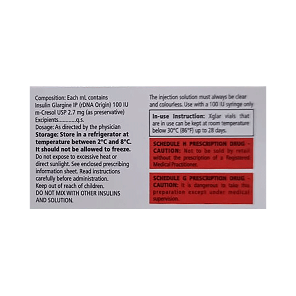 Xglar Solution for Injection is a long-acting type of insulin used to treat type 1 and 2 diabetes mellitus in both adults and children. It provides a steady level of insulin in the body for an entire day and helps control blood sugar levels. This helps prevent complications associated with diabetes. Xglar Solution for Injection can be prescribed alone or in combination with fast-acting insulin or other diabetes medicines. Your doctor or nurse will teach you how to inject it under the skin correctly. You should use this medicine regularly per the dose advised to get the maximum benefit. If you stop taking it, your blood sugar levels may rise very high, which may put you at risk of serious complications. It is only a part of the treatment program that should include a healthy diet, regular exercise, and weight reduction, as your doctor advises.The most common side effect of Xglar Solution for Injection is low blood sugar levels (hypoglycemia). To prevent this, it is important to inject only the correct dose of medicine, have regular meals, and monitor your blood sugar levels regularly. Drinking excessive alcohol can also lead to a fall in your blood sugar levels. Other common side effects include peripheral edema, lipodystrophy, allergic reactions, injection site reactions, itching, rashes, and weight gain.Do not use Xglar Solution for Injection when you have low blood sugar levels. Before starting the treatment, inform your doctor if you have ever had kidney, liver, or heart problems. Pregnant or breastfeeding women should consult their doctor before using it.