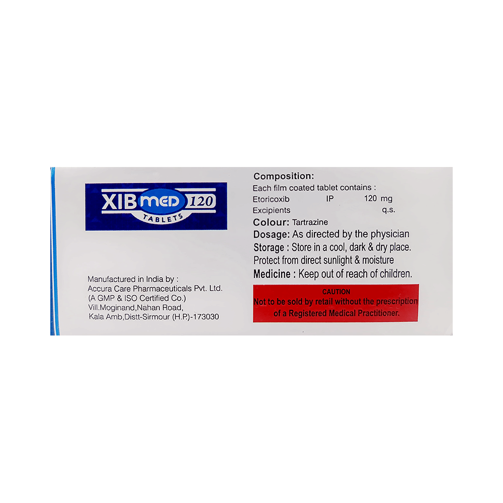 Xibmed 120 Tablet is a pain-relieving medicine. It is used for relieving moderate pain and swelling of joints associated with different forms of gout and arthritis. It effectively alleviates pain, redness, and swelling. Xibmed 120 Tablet should be taken in the dose and duration as advised by your doctor. Xibmed 120 Tablet may be taken with or without food. Do not take more than prescribed dose.Flu-like symptoms, indigestion, stomach pain, diarrhea, indigestion, edema, headache, palpitations, and hypertension are some of the side effects that might be seen with this medicine. It may also cause dizziness and fatigue. You should not drive or do anything requiring concentration until you know how it affects you.Xibmed 120 Tablet is potentially unsafe to take it during pregnancy. Inform your doctor if you have a history of stomach ulcers, heart diseases, high blood pressure, and liver or kidney disease.
