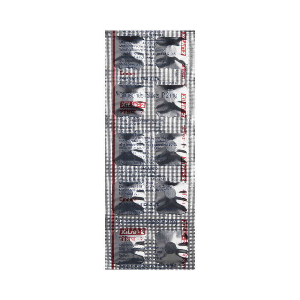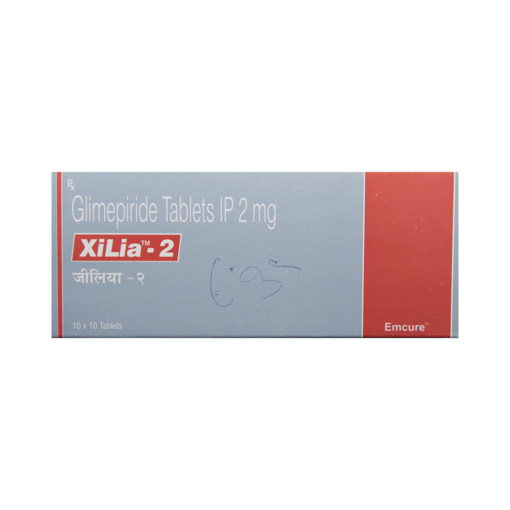Xilia 2 Tablet belongs to a group of medicines called sulfonylureas and is used to treat type 2 diabetes mellitus in adults. It helps control blood sugar levels in people with diabetes thereby preventing serious complications of diabetes such as kidney damage and blindness. Xilia 2 Tablet may be used alone or along with other medicines. It should be taken just before or with the first meal of the day. Take it regularly at the same time each day to get the maximum benefit. Your doctor will decide what dose is best for you and this may change from time to time according to your blood sugar levels.Keep taking Xilia 2 Tablet, even if you feel well or your blood sugar levels are controlled. If you stop it without consulting your doctor, your blood sugar levels could rise to put you at risk of diabetes complications such as kidney damage, blindness, nerve problems, and loss of limbs. Remember that it is only part of a treatment program that should also include a healthy diet, regular exercise, and weight reduction as advised by your doctor. Your lifestyle plays a big part in controlling diabetes.The most common side effects of taking Xilia 2 Tablet include low blood sugar levels (hypoglycemia), nausea, headache, weakness, and dizziness. Make sure you recognize the signs of having low blood sugar levels, such as sweating, dizziness, headache, and shaking, and know how to deal with them. To prevent this, it is important to have regular meals and always carry a fast-acting source of glucose such as sugary food or fruit juice with you. Drinking alcohol can also increase your risk of low blood sugar levels and hence should be avoided. Some people may experience an increase in weight with this medicine.You should not take Xilia 2 Tablet if you have type 1 diabetes mellitus, diabetic ketoacidosis (high levels of acid in your blood), or if you have severe kidney or liver disease. Before taking this medicine, tell your doctor if you have ever had heart disease, thyroid disease, or some hormonal conditions, as it may not be suitable. Pregnant or breastfeeding women should also consult their doctor before taking it. Your blood sugar levels should be checked regularly and your doctor may also advise blood tests to monitor your blood cell counts and liver function.