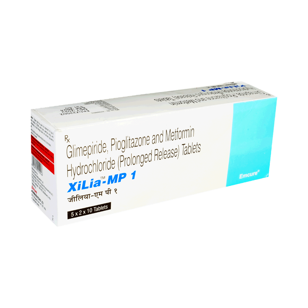 Xilia-MP 1 Tablet PR is a combination medicine that helps control blood sugar levels. This medicine is used together with diet and exercise to improve blood sugar control in adults with type 2 diabetes mellitus. It helps in proper utilisation of insulin, thereby lowering the blood sugar levels. Xilia-MP 1 Tablet PR should be taken in the dose and duration as advised by your doctor. It must be taken with food to avoid stomach upset. If you miss a dose, take it as soon as possible. However, if it is almost time for your next dose, skip the missed dose and go back to your regular schedule. Do not double the dose. Overdose may lead to low blood sugar (hypoglycemia).Some people may develop hypoglycemia (low blood sugar level) when this medicine is taken along with other antidiabetic medicines, alcohol or upon skipping a meal. Monitor your blood sugar levels regularly while taking it. Other common side effects of this medicine include nausea, diarrhea, stomach pain, headache, bone fracture, and respiratory tract infection.Before taking this medicine, inform your doctor if you have any kidney, liver or heart problems. Pregnant or breastfeeding women should also consult their doctor before taking it. Your doctor will check your kidney function tests before starting treatment with it. Avoid excessive alcohol intake while taking it as this may increase the risk of developing some side effects.