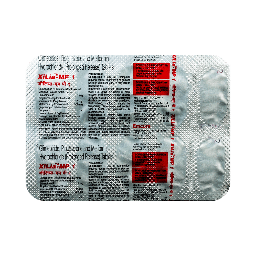 Xilia-MP 1 Tablet PR is a combination of three antidiabetic medicines: Glimepiride, Metformin and Pioglitazone. They work by different mechanisms to provide better control of blood sugar when single or dual therapy is not effective. Glimepiride is a sulfonylurea which works by increasing the amount of insulin released by the pancreas in order to lower the blood glucose. Metformin is a biguanide. It works by lowering glucose production in the liver, delaying glucose absorption from intestines and increasing the body's sensitivity to insulin. Pioglitazone is a thiazolidinedione which further increases insulin sensitivity.