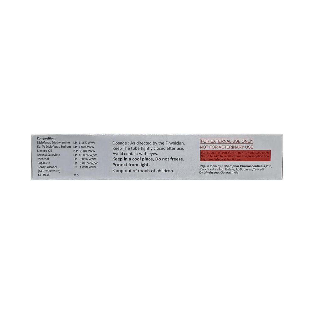 Salt Composition: Diclofenac (1.16% w/w) + Capsaicin (0.025% w/w) + Methyl Salicylate (10.00% w/w) + Menthol (5.00% w/w) + Linseed Oil (3.00% w/w)