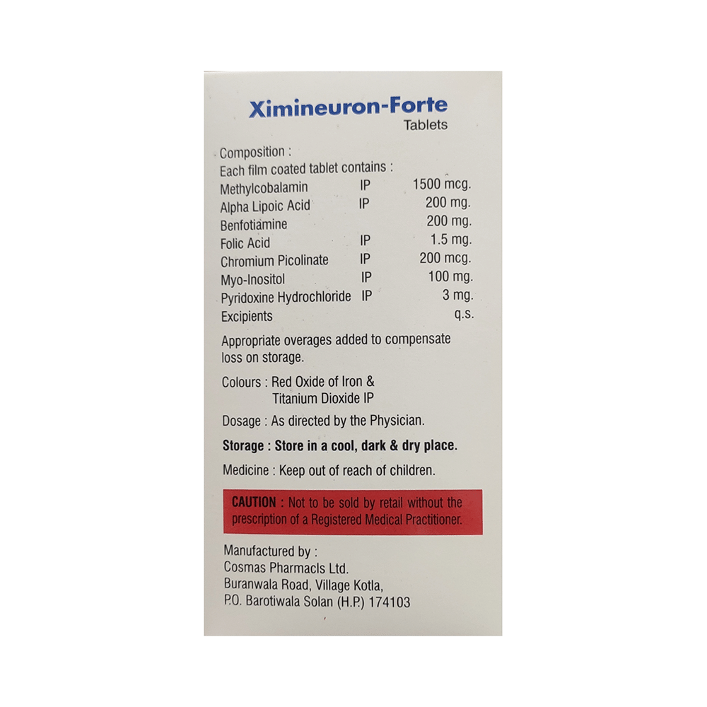 Ximineuron-Forte Tablet is a combination of vitamin and mineral supplements. Alpha-lipoic acid is an antioxidant that protects the brain and nerves from harmful free radicals. It also lowers “bad” cholesterol and breaks down carbohydrates to make energy. Benfotiamine treats vitamin B1 deficiency and the nerve damage caused by this deficiency. Chromium picolinate reduces insulin resistance and the risk of cardiovascular disease and type 2 diabetes. Folic acid is essential for the production of red blood cells. It prevents and treats folate deficiency and anemia. Methylcobalamin corrects vitamin B12 deficiency, thereby helping in treating certain anemias and nerve problems. Myo-inositol is an insulin-sensitizing agent that decreases insulin resistance. Pyridoxine treats or prevents vitamin B6 deficiency and improves the functioning of the nervous and immune systems.