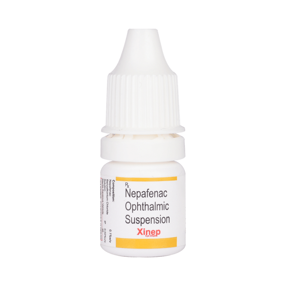 Xinep Eye Drop is a pain relieving medicine used to treat pain and inflammation associated with cataract surgery. It blocks and reduces the release of certain chemicals in the eye that cause pain and swelling. This makes the healing process after eye surgery more comfortable and helps the eye heal faster. Always wash your hands before using Xinep Eye Drop. Use only the number of drops that your doctor has prescribed and wait for about five minutes between each drop. If you wear contact lenses, remove them before using the drops and wait for at least 15 minutes before putting them back in. You should not touch the tip of the dropper or bottle. This may lead to infection.Use of the medicine may cause decreased vision, foreign body sensation in the eyes, and increased intraocular pressure. These are usually temporary and resolve with time. However, if they persist or get worse, you should let your doctor know. Your doctor may be able to suggest ways of preventing or reducing the symptoms.Before using this medicine, you should tell your doctor about all the other medicines you are taking. You should also tell your doctor if you have any other medical conditions or disorders. Pregnant and breastfeeding women should consult with their doctors before using the medicine.