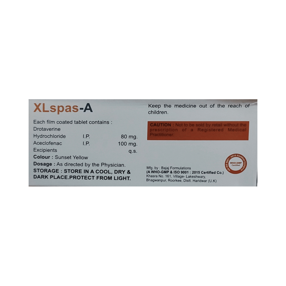 Xlspas-A Tablet is a combination of two medicines: Drotaverine and Aceclofenac, which relieves abdominal pain and cramps. Drotaverine is an anti-spasmodic medicine which relieves contractions (spasms) associated with smooth muscles in the abdomen. Aceclofenac is a non-steroidal anti-inflammatory drug (NSAID). It works by blocking the release of certain chemical messengers that cause abdominal pain and inflammation (swelling).