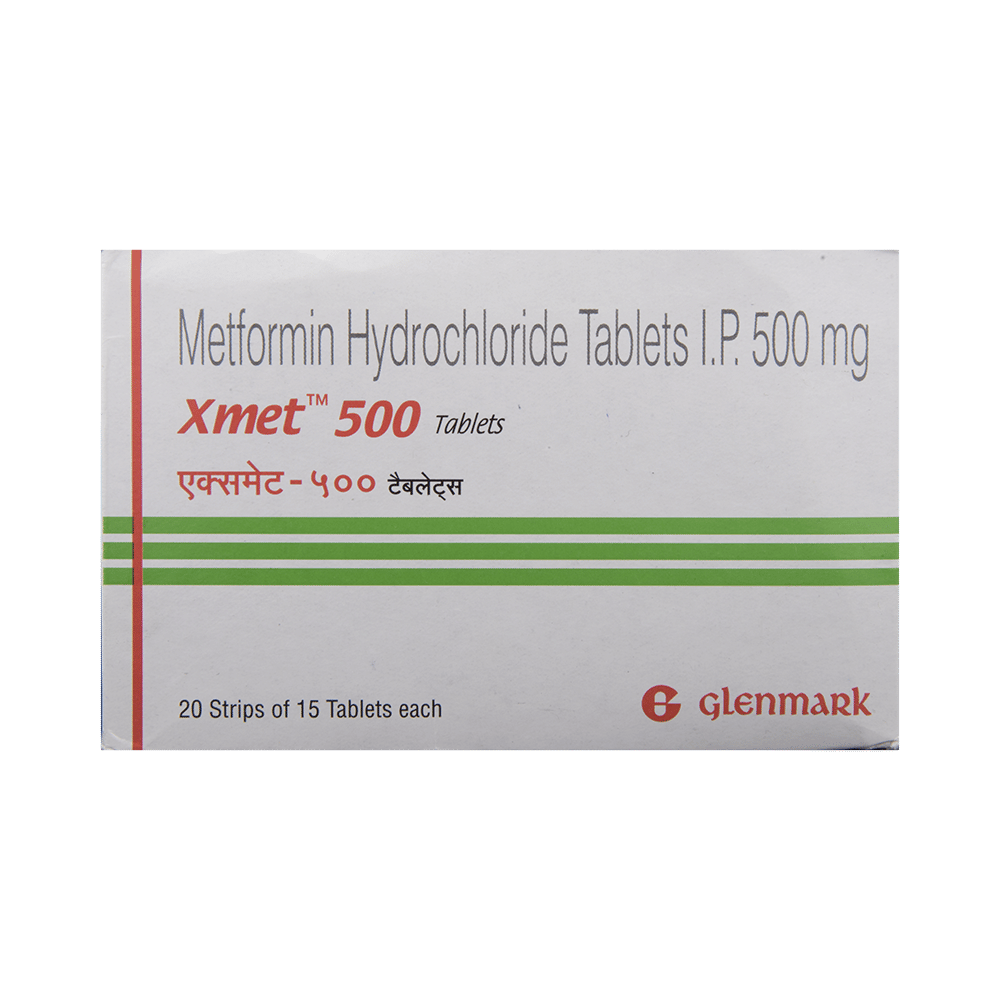 Xmet 500 Tablet is a medicine used to treat type 2 diabetes mellitus. It helps control blood sugar levels and thus prevents serious complications of diabetes. It is also used to treat a menstruation-related disorder known as polycystic ovary syndrome (PCOS) in women. Xmet 500 Tablet is best taken with food to avoid nausea and abdominal pain. You should take it regularly, at the same time each day, to get the most benefit. You should not stop taking this medicine unless your doctor recommends it. Your lifestyle plays a big part in controlling diabetes. Therefore, it is important to stay on the diet and exercise program recommended by your doctor while taking this medicine.The most common side effects of this medicine include diarrhea, nausea, vomiting, abdominal discomfort, headache, and loss of appetite. Some people may develop hypoglycemia (low blood sugar level) when this medicine is taken along with other antidiabetic medicines or alcohol or upon skipping a meal. Monitor your blood sugar levels regularly while taking it.Before taking this medicine, inform your doctor if you have any kidney, liver, or heart problems. Pregnant or breastfeeding women should also consult their doctor before taking it. Your doctor will check your kidney function before starting treatment with it. Avoid excessive alcohol intake while taking it, as this may increase the risk of developing some side effects.