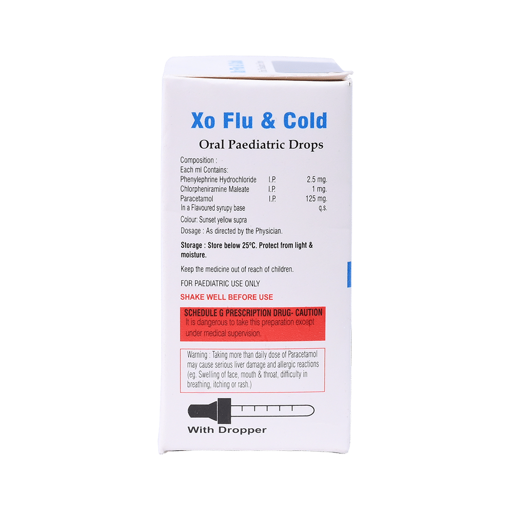 XO Flu & Cold Oral Drops is a medicine used in the treatment of common cold symptoms. It provides relief from symptoms such as headache, sore throat, runny nose, muscular pain, and fever. XO Flu & Cold Oral Drops can be taken with or without food. The dose and duration will depend on the severity of your condition. You should keep taking the medicine even if you feel better until the doctor says it is alright to stop using it.Using this medicine may cause a few common side effects such as nausea, vomiting, sleepiness, dizziness, and headache. If any of these side effects do not resolve with time or get worse, you should let your doctor know. Your doctor may be able to suggest ways of preventing or reducing the side effects. In general, you should try to use the smallest amount necessary to control your symptoms.Before using the medicine, you should tell your doctor if you have any other medical conditions or disorders. To make sure it is safe, you should let your doctor know all the other medicines you are taking. Also, tell your doctor if you have any problems with the liver or kidneys. Avoid consumption of alcohol while on treatment with this medicine as it may increase the chance of some side effects. Pregnant and breastfeeding women should consult their doctors first before using the medicine.