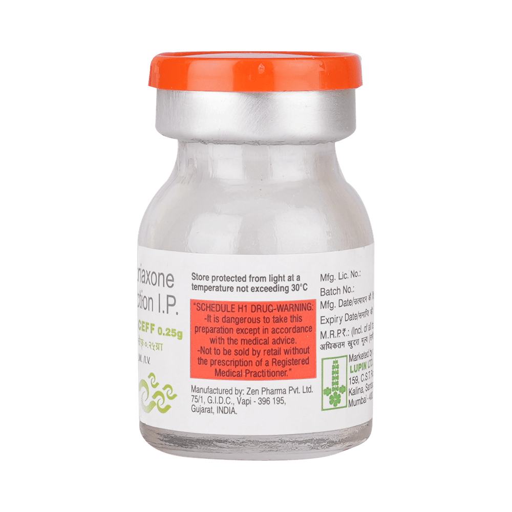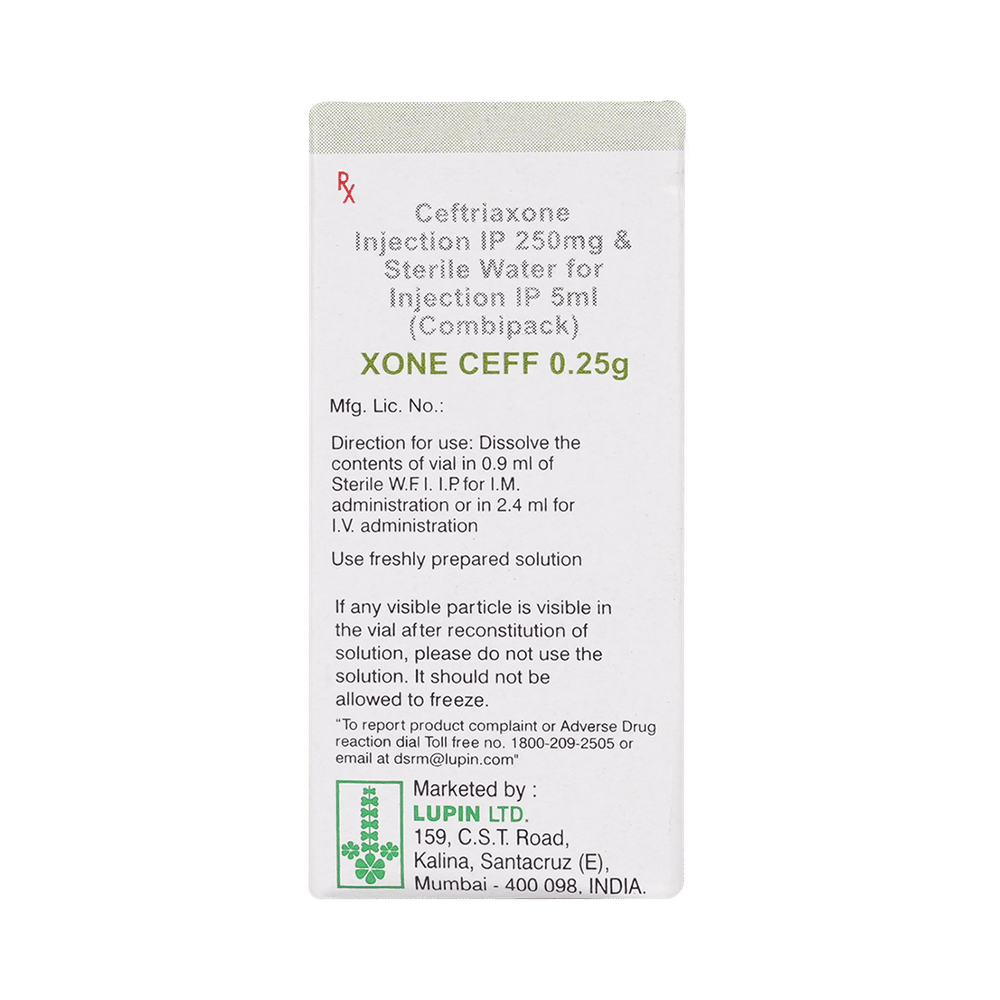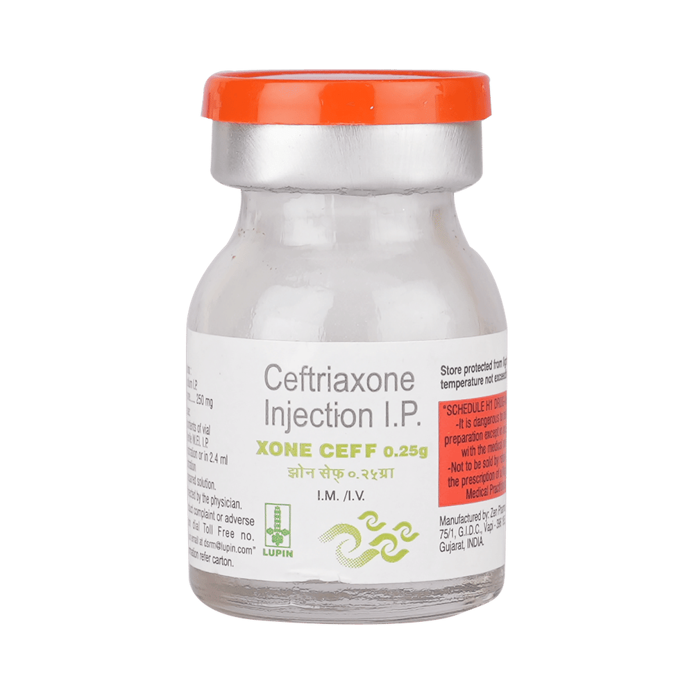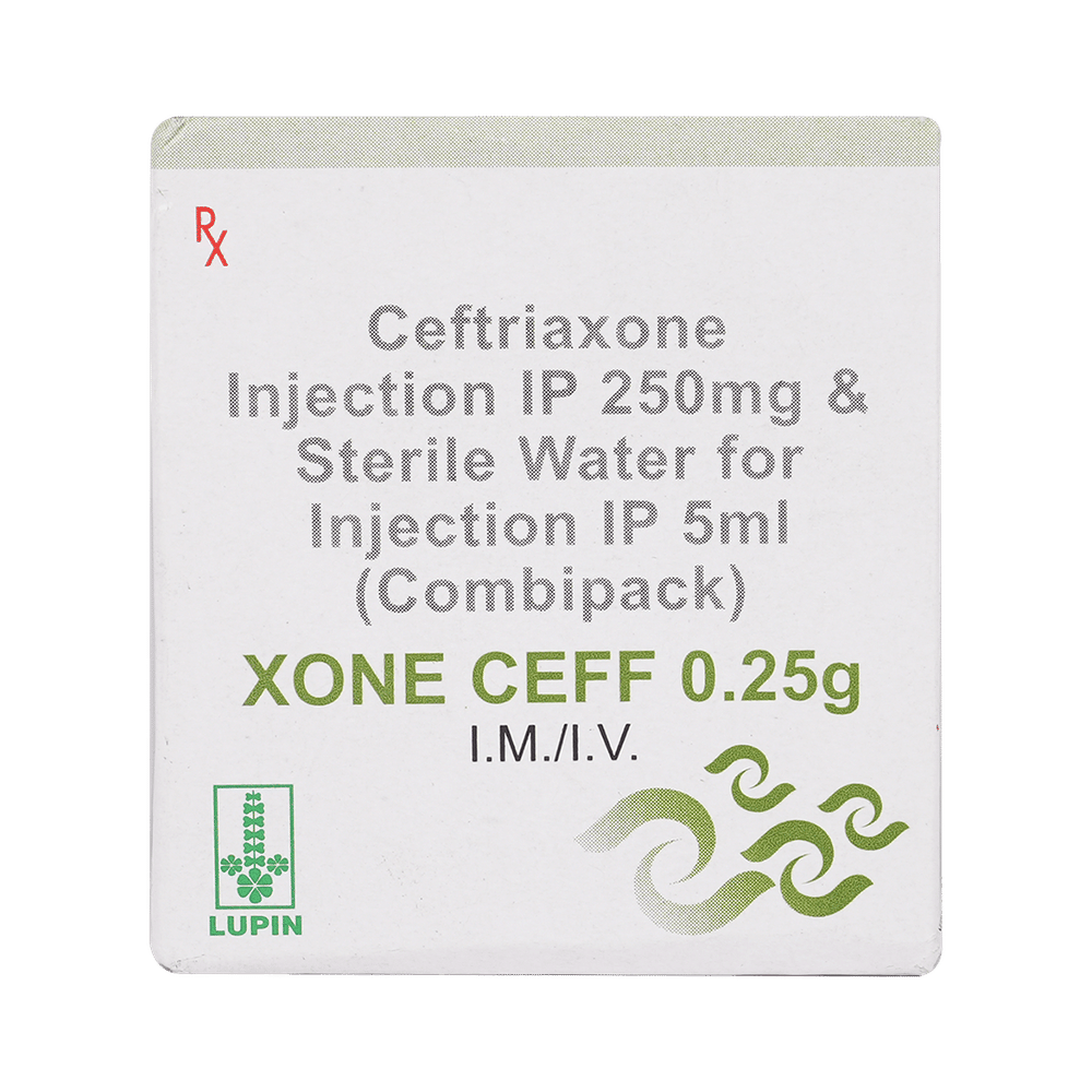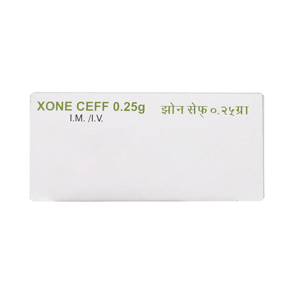 Xone Ceff 250mg Injection is a medicine used to treat bacterial infections in your body. It is effective in infections of the brain (e.g., meningitis), lungs (e.g., pneumonia), ear, urinary tract, skin and soft tissues, bones and joints, blood, and heart. Xone Ceff 250mg Injection may also be used to prevent infections during surgery. It is given as a drip (intravenous infusion) or as an injection directly into a vein or a muscle under the supervision of a doctor. Your doctor will decide the correct dose for you. This medicine will be given to you regularly at evenly spaced intervals as per the schedule prescribed by your doctor. Do not skip any doses and finish the full course of treatment even if you feel better. Stopping the medicine too early may lead to the return or worsening of the infection.The most common side effects of Xone Ceff 250mg Injection include diarrhea, rash, changes in liver function tests, and blood cell counts (such as high eosinophil count, decreased white blood cells, and low blood platelets). Some people may develop temporary redness or pain at the site of injection. These side effects are usually mild, but let your doctor know if they bother you or do not go away.Before taking Xone Ceff 250mg Injection, you should let your doctor know if you are allergic to any antibiotics or have any kidney or liver problems. You should also let your doctor know about all other medicines you are taking, as they may affect, or be affected by, this medicine.