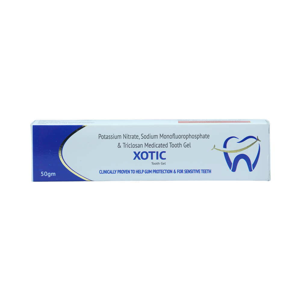 Xotic Oral Gel is a combination of three medicines: Potassium Nitrate, Sodium Monofluorophosphate and Triclosan. Potassium Nitrate works by calming the nerves in the teeth to reduce sensitivity from hot and cold foods. Sodium Monofluorophosphate works by making the teeth stronger and preventing decay (cavity) caused by bacteria. Triclosan kills the harmful bacteria and fungi by attacking their outer covering.