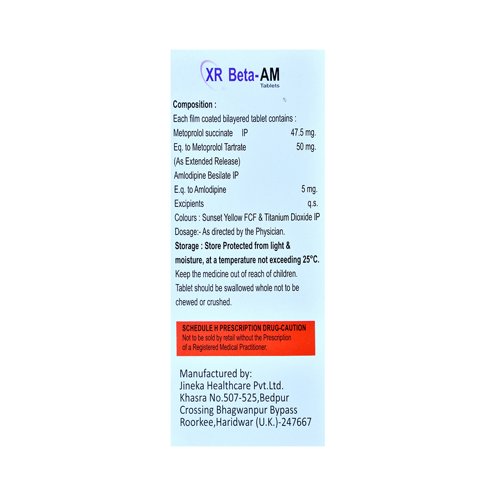 XR Beta-AM Tablet contains two medicines, both of which help to control high blood pressure and heart rate. It is also used for heart-related chest pain (angina), abnormal heart rhythms and chronic (long-term) heart failure. You can take XR Beta-AM Tablet at any time of day, with or without food, but it is best to take it at the same time each day. Keep taking it for as long as advised by your doctor. Even if you feel well, do not stop this medicine on your own because high blood pressure often has no symptoms. If you stop taking it, your condition may get worse. Keeping active with regular exercise, reducing your weight and eating a healthy diet will also help control your blood pressure. Follow your doctor’s advice while taking this medicine.It may cause side effects like headache, ankle swelling, skin rash, slow heart rate, nausea,a nd depression. It may also cause dizziness, so do not drive or do anything that requires mental focus until you know how this medicine affects you. This might raise the level of potassium in the blood, hence avoid potassium rich food or supplements. You may be asked for regular monitoring of blood pressure, kidney function, and electrolytes level while on the treatment.Before taking it, let your doctor know if you have any liver or kidney problems. Pregnant or breastfeeding women should also consult their doctor for advice before taking this medicine. You also need to tell your doctor what other medicines you are taking especially those used to treat high blood pressure or heart conditions.